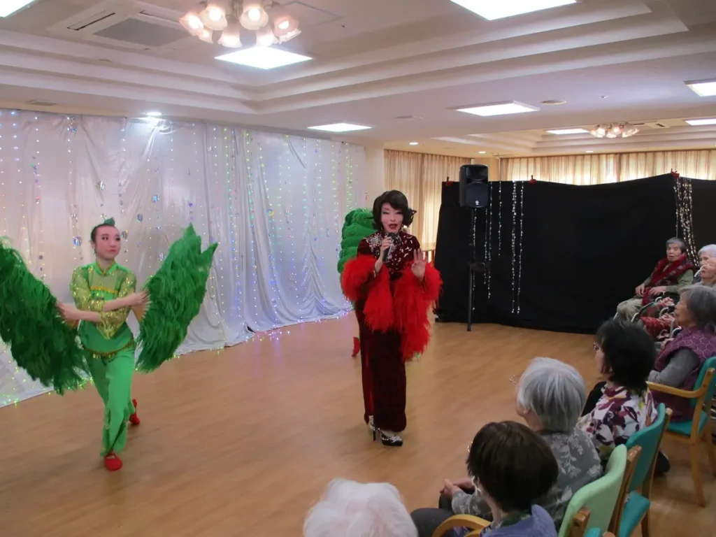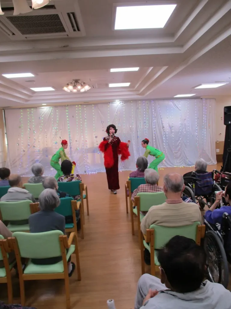 ベストライフ本厚木に「呼華歌劇団」が来てくださいました!華麗なダンスと美しい歌声で、ご入居者様を魅了。歌に聞き惚れ、うっとりとした表情で鑑賞されるご様子が印象的でした。最後は皆さまで記念撮影。ご入居者様からは「楽しかった」「また来て、すぐ来てね」「こういうの大好き!」「去年も良かったけど、今年は着物が素敵ね!!」などのお声が聞かれ、大変喜んでいただきました。