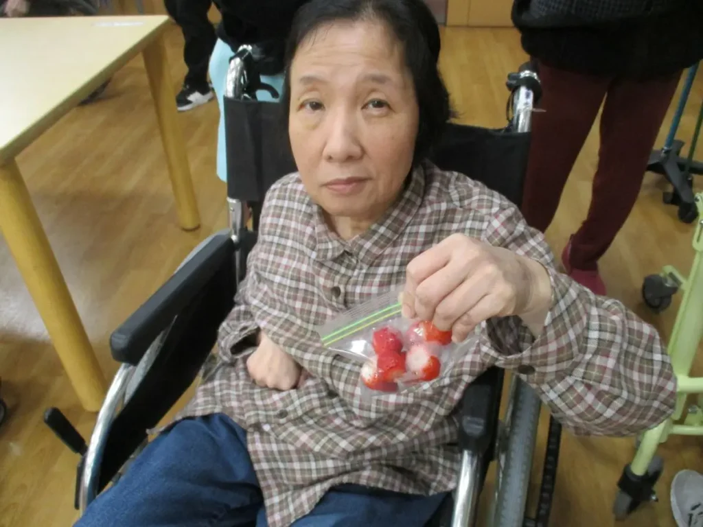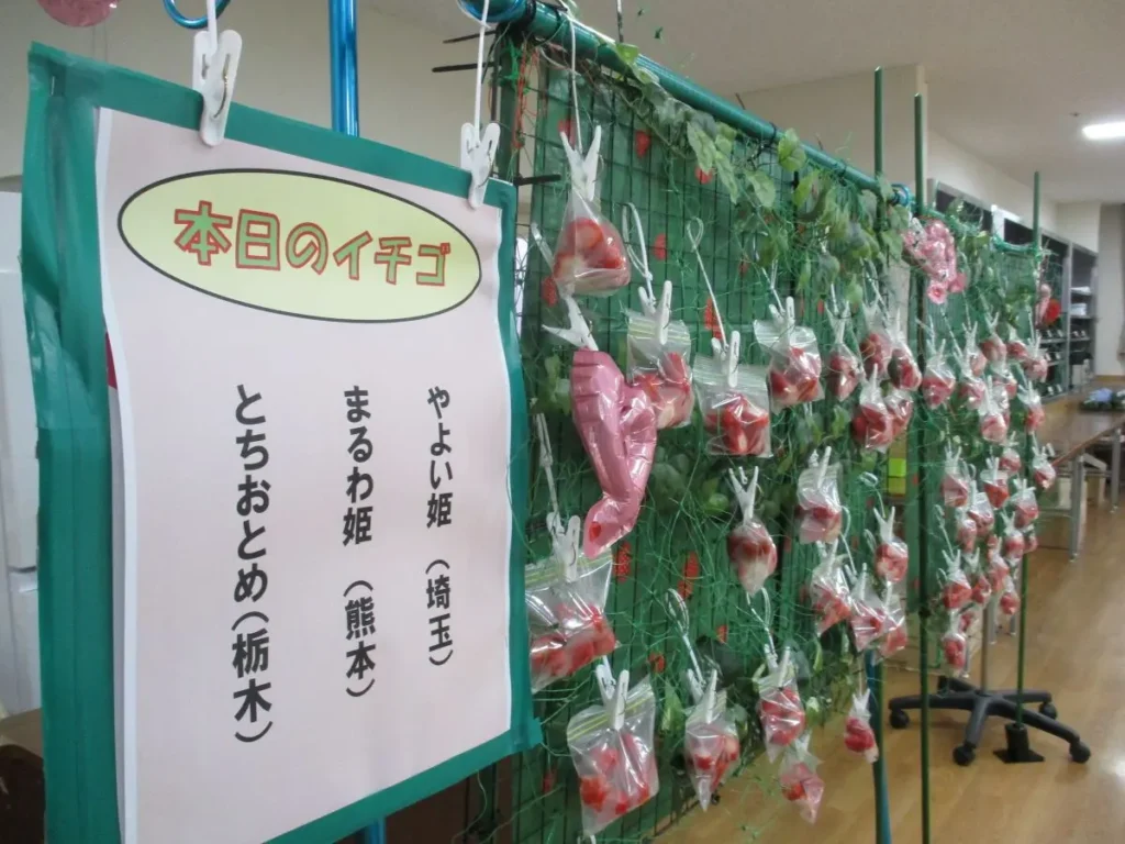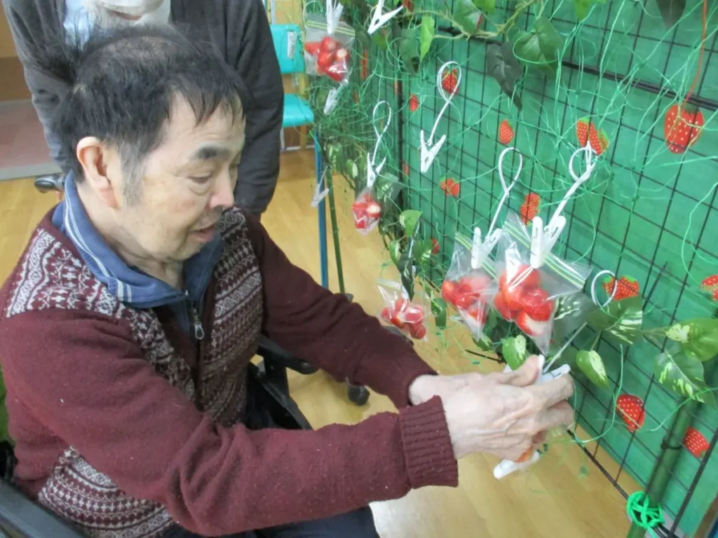皆さま「どれがいいかな?」と選びながら手を伸ばし、いちごを取る様子が印象的でした。実際に手に取って味わうことで季節を感じていただけたご様子で、たくさんの笑顔も見せていただけました。 これからも、楽しく季節を感じていただける行事を行っていきます。