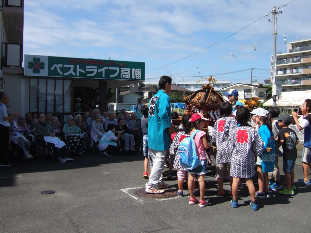 町内会のお祭りでお神輿が施設前まで来てくださいました。