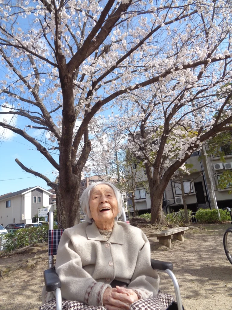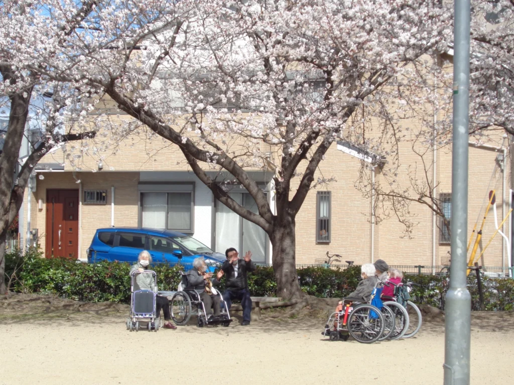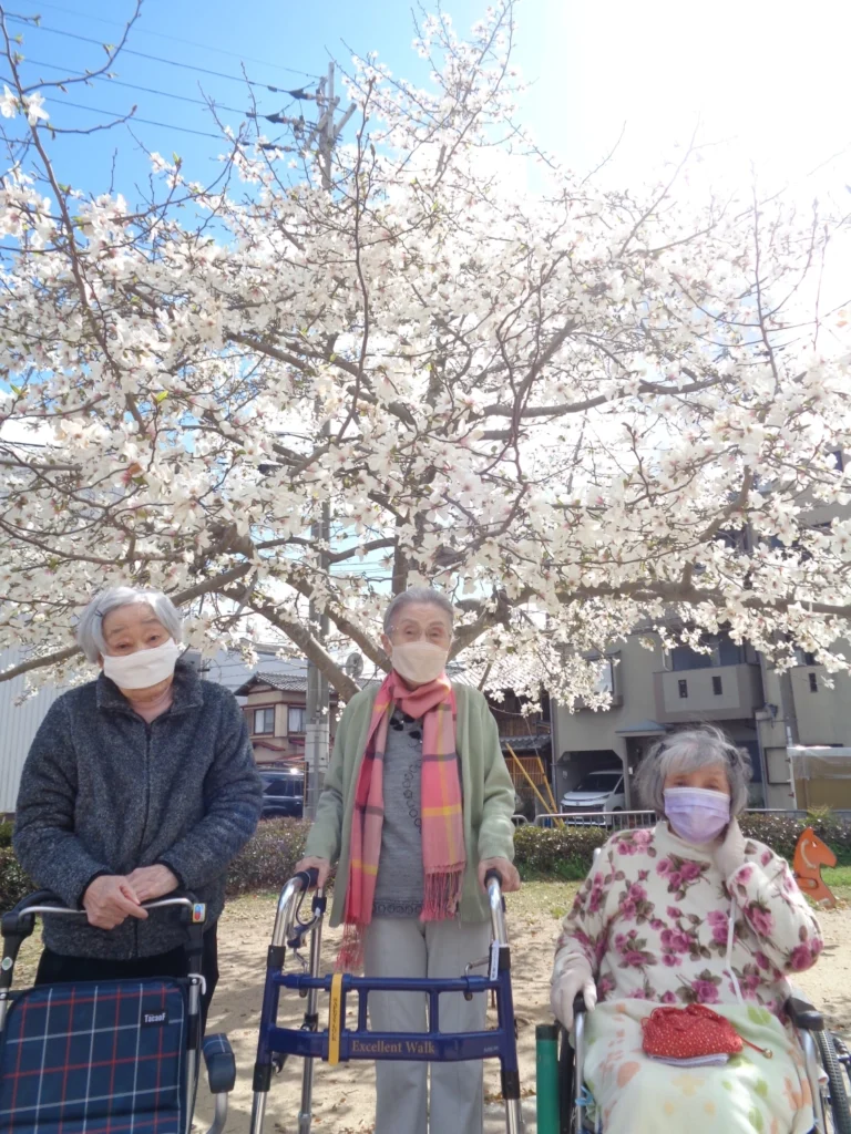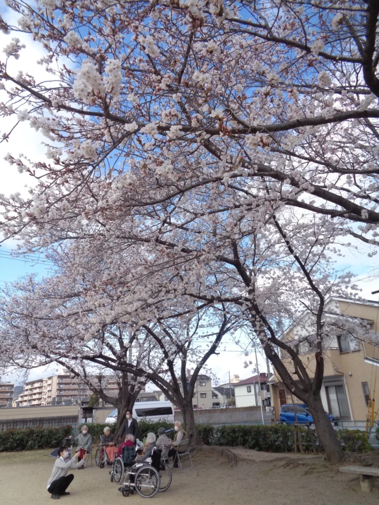 お花見を楽しんでいただきたく、近くの公園まで介護職員と看護職員が同伴する外出レクを企画しました。
