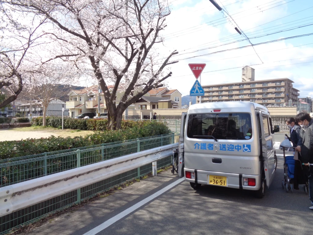 参加のご希望をうかがい、車いすのままお乗りいただける車両で移動します。少し肌寒い日もありましたが、数日に分かれて、桜の木の下でつかの間のお茶会を開催しました。桜に負けないくらいの素敵な笑顔が咲いていました。