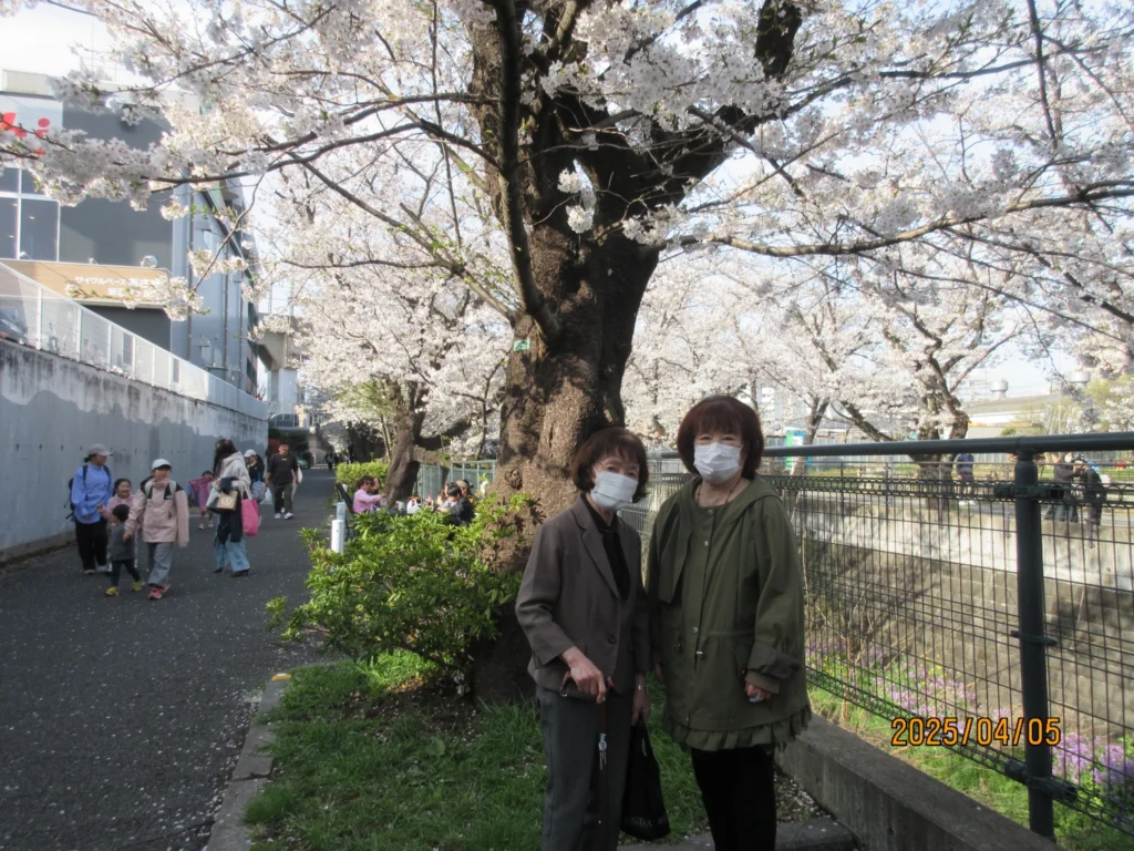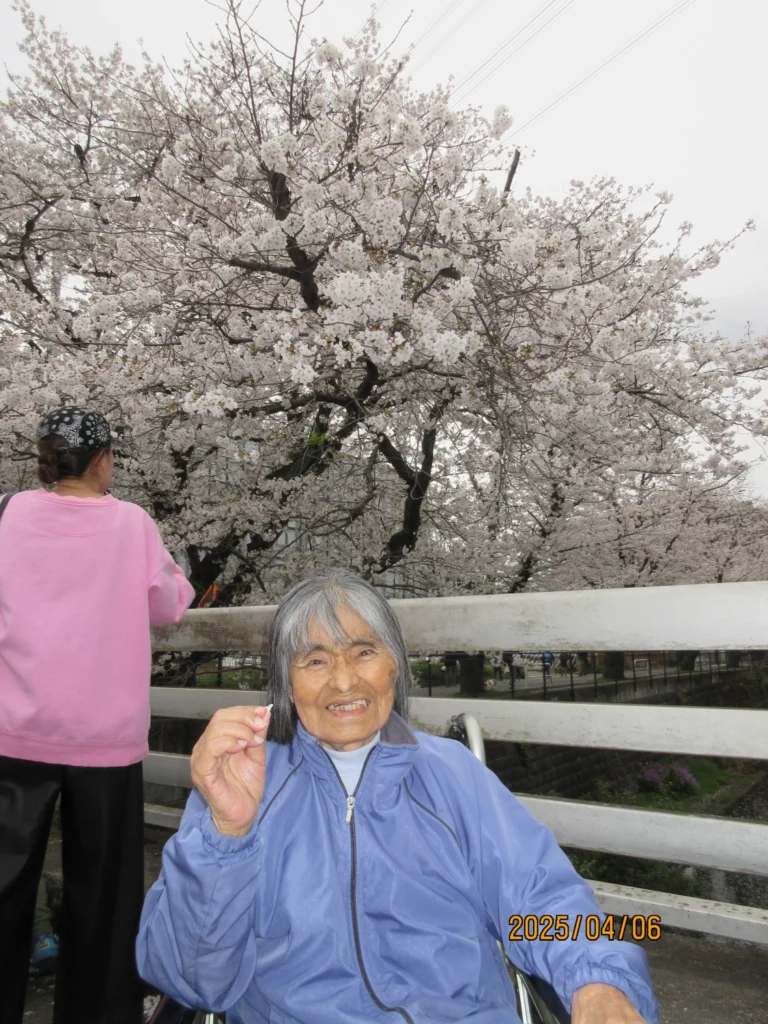 お花見は一年を通しての行事の中でもメインイベントのひとつです。 車いすの方も皆さまでお花見に出かけています。目の前に広がる桜並木を見て「素晴らしいわねぇ、来てよかった」「部屋の窓からも見えるけど、やっぱり近くで見るといいわね」と会話にも花が咲き、短い春を満喫されていました。