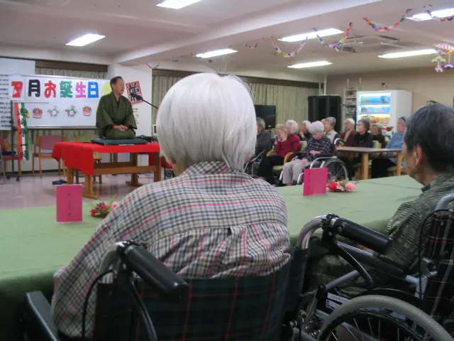 ベストライフ名古屋で、1月中にめでたくお誕生日を迎えられたご入居者様は14名。昼食では豪華な松花堂弁当でお祝いし、午後からは地元のアマチュア落語家をお招きしての独演会を開催。会場は爆笑の渦に包まれ、大盛況のお誕生日会となりました。
