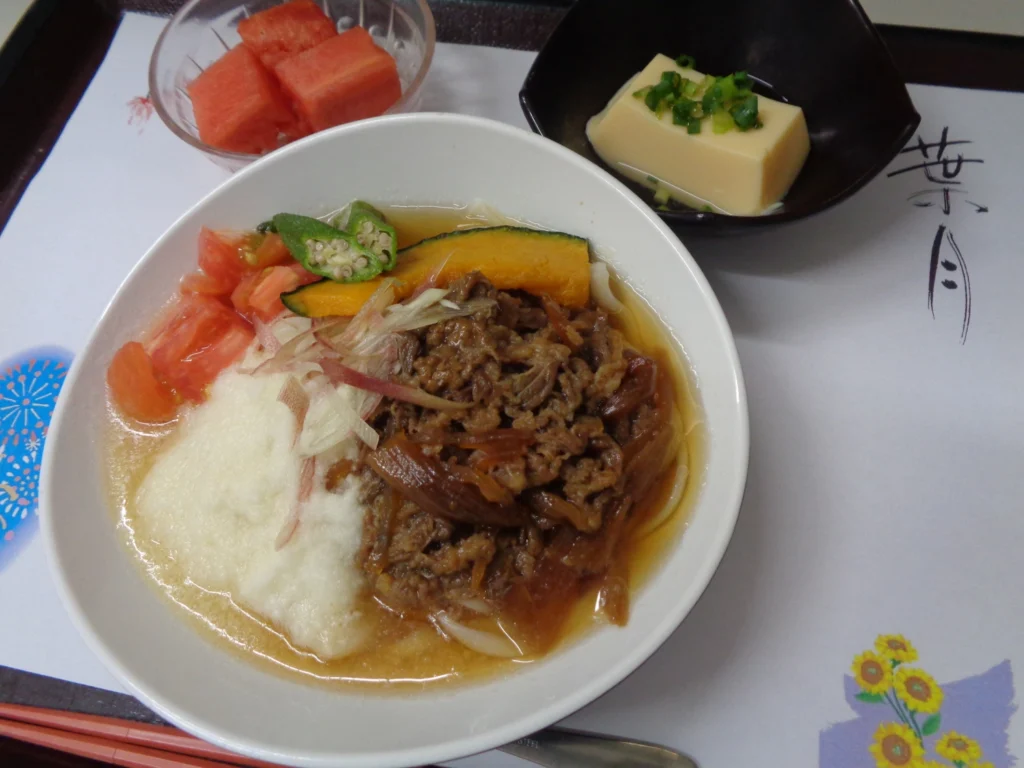 『お誕生日会』の昼食は夏のイベント食、「黒毛和牛の冷やしぶっかけうどん」をご提供しました。また、レクリエーションの時間にて8月生まれのご入居者様をご紹介し、みんなでお祝いをさせていただきました。