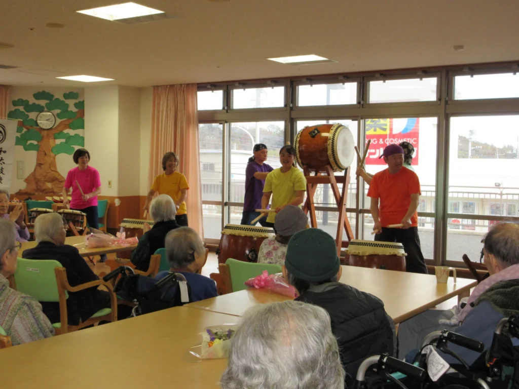 今回は『和太鼓』ボランティアさんによる演奏を鑑賞した後は、ご入居者様にも楽器に触れていただき、一緒に演奏をしました。