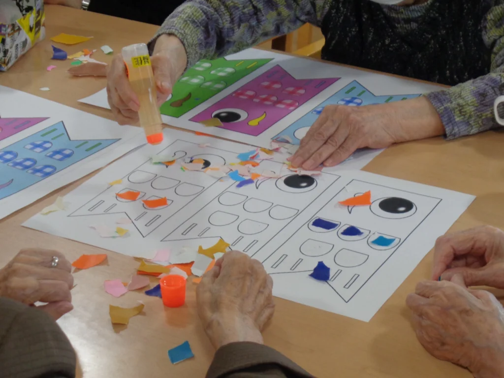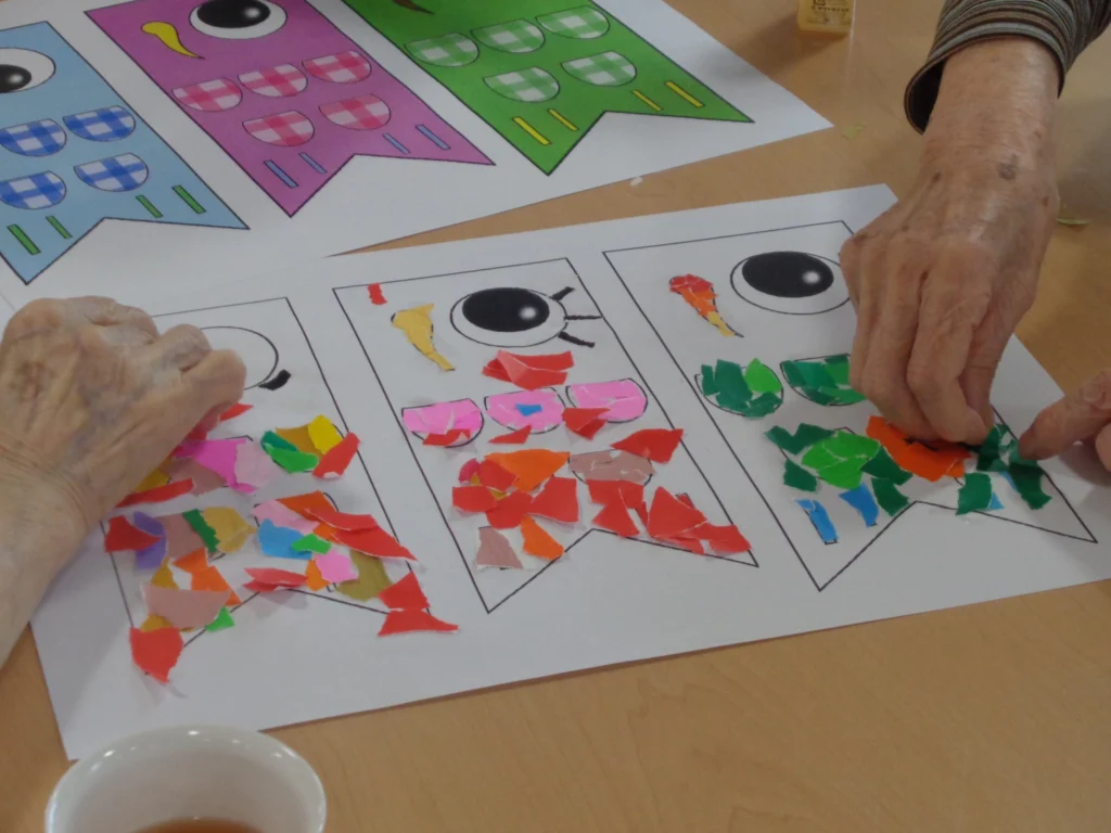 5月は鯉のぼりのちぎり絵を楽しんでいただきました。少人数のグループに分かれていただき、どのような色にするか相談をしながら仕上げていきます。