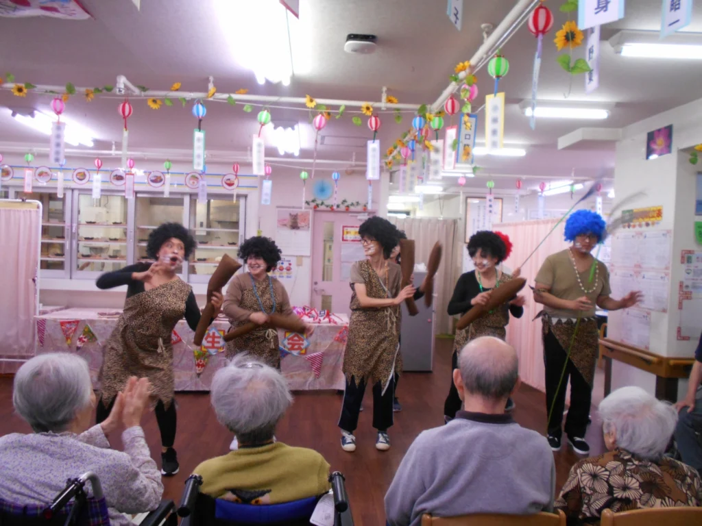 歌自慢のご入居者様はマイクを握りしめ、歌を披露。職員による歌とダンスも。