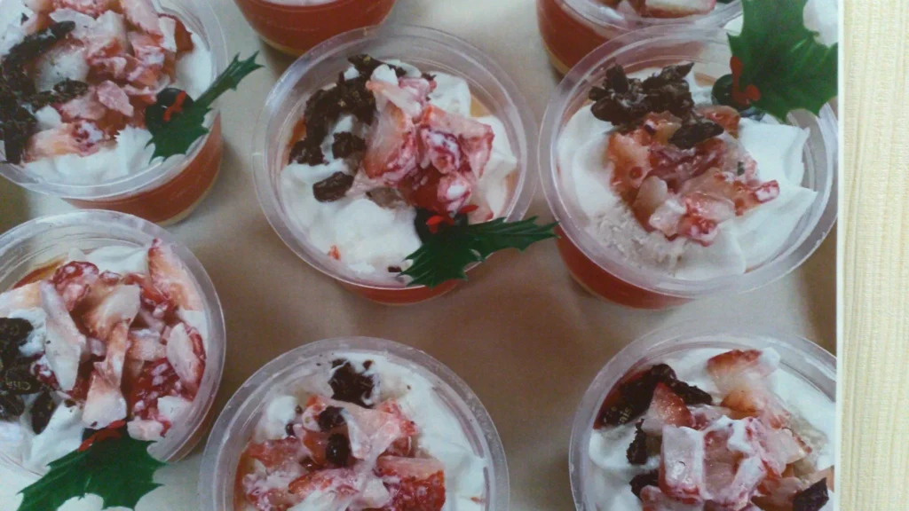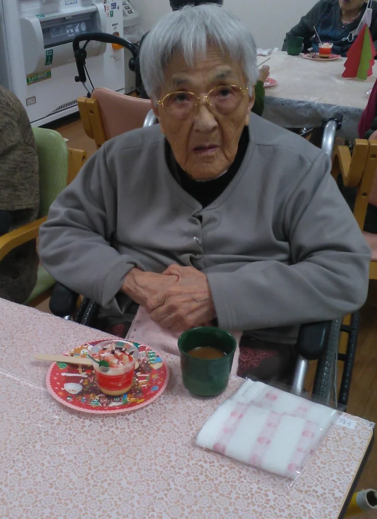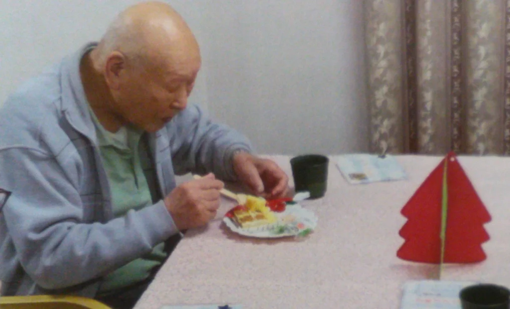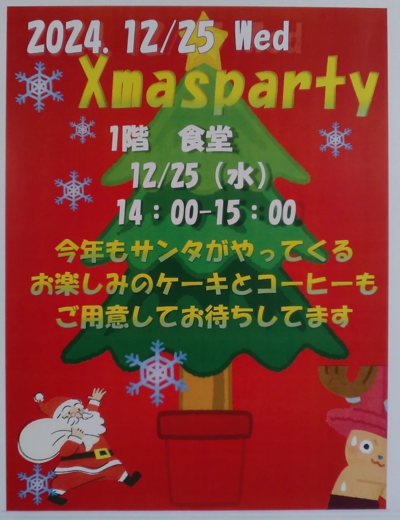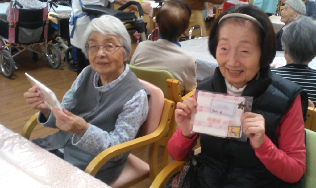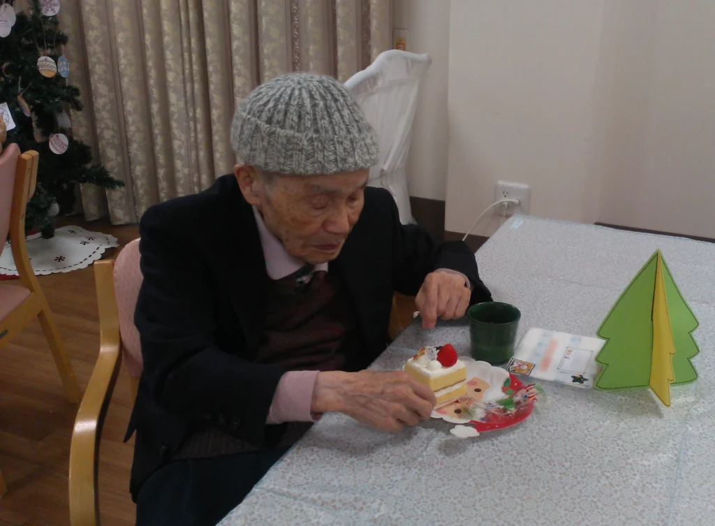 「盛り上げ隊」の職員が扮するサンタクロースとトナカイの登場に、多くの拍手をいただきました。今年は、「名前入りミニタオル」とクリスマスケーキをプレゼントにご用意。ご入居者様からは「タオル、かわゆぅ~て使えんわぁ」「甘いもんは 別腹よ~」など、笑顔あふれる楽しい時間を過ごしていただきました。