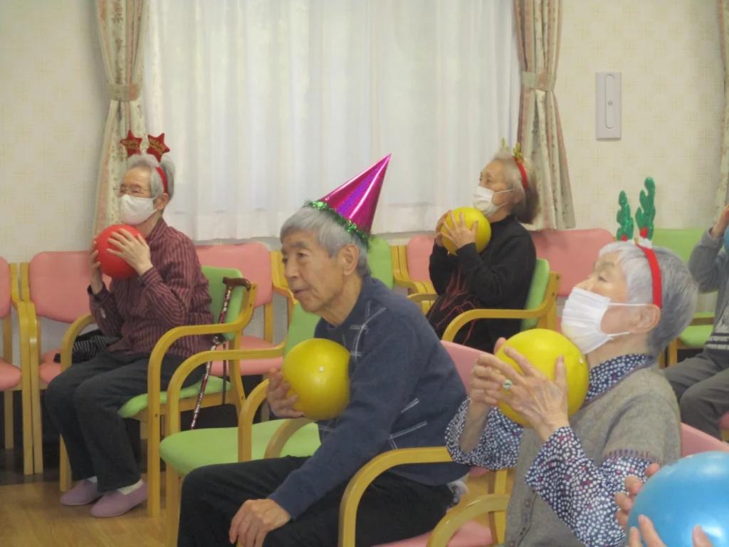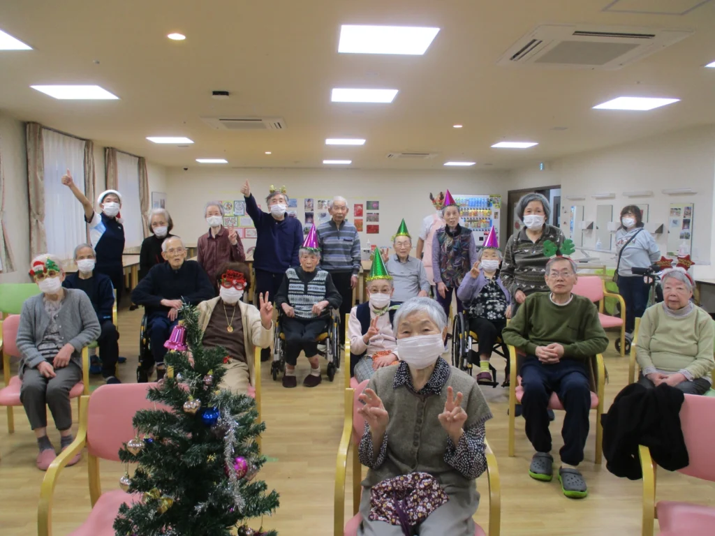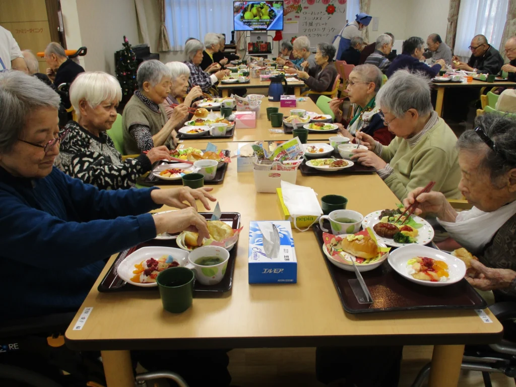 昼食にはクリスマスの特別メニューを召し上がっていただきました。また、2024年はちょうど体操レクの日でもあったので、午後は体操の先生と一緒に体操をしながらのイベントとなりました。例年と少し趣向が違いましたが、皆さま楽しんでいらっしゃいました。