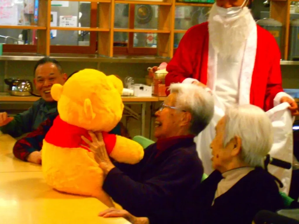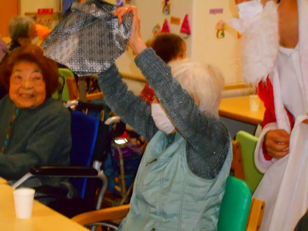 サンタから手渡されたプレゼントの予想外の中身に、思わず大笑い。かわいらしいものや便利なものまで。プレゼントを見せ合いながら、ご入居者様同士の交流も深まり、笑顔あふれる一日となりました。
