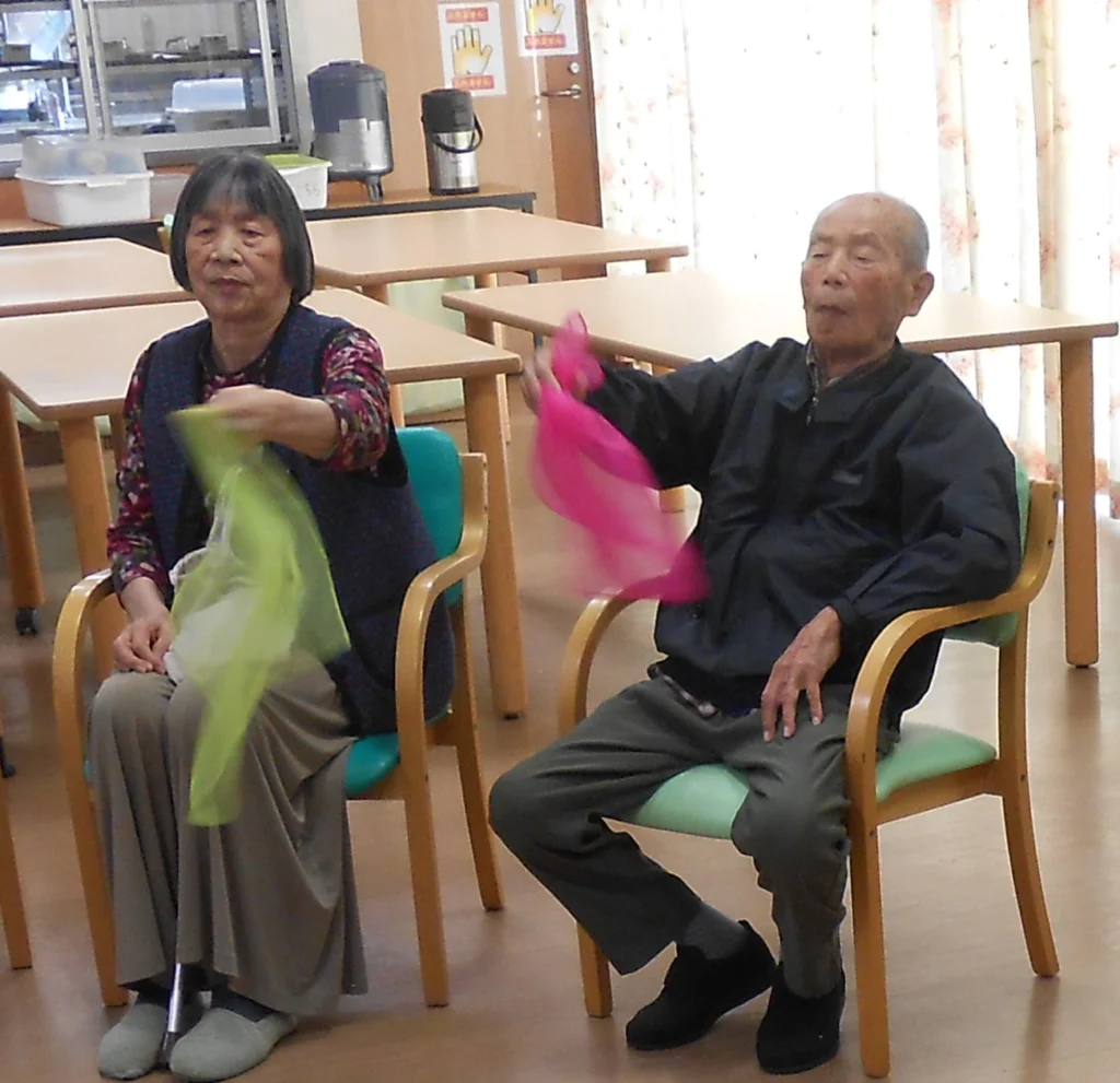 毎週1回、外部講師によるダンスセラピーを行っています。道具なども使いながら音楽に合わせて踊ります。 始めは振り付けに慣れず硬い表情の方が多いですが、だんだんと慣れ、誰かと目が合い微笑んだり、笑顔が見え始めます。皆さまで一緒に踊ることで交流を深め、心身も健康な状態に導く効果があるそうで、大変人気のレクリエーションとなっています