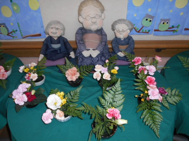 月に一度開催しているフラワーアレンジメントのレクリエーションには、男女を問わず、多くのご入居者様が参加してくださいます。皆さまに同じ素材が用意されますが、思うままにオアシスに飾っていくと、本当に同じ素材なのかと思うほど個性溢れる作品が出来上がります。完成作品は施設入り口に飾り、皆さまをお迎えします。