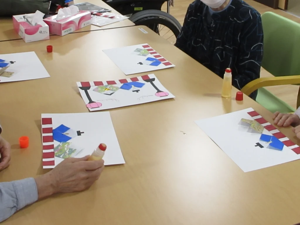 日々のレクリエーションでは、季節に合わせた創作物や折り紙を使った飾りづくりを行っています。中でも折り紙を用いた飾り作りは特に人気で、お一人おひとりに作っていただいたパーツを少しずつ組み合わせて、毬やくす玉を完成させています。