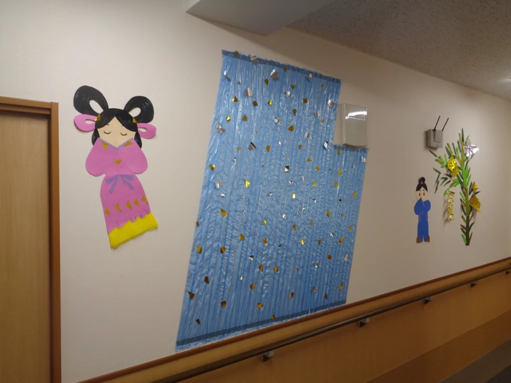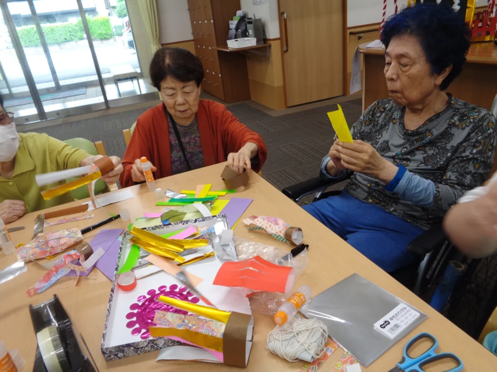 七夕飾りの制作と飾りつけを、ご入居者様と一緒に行いました。