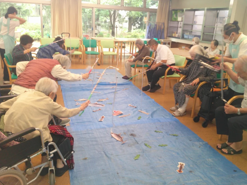 1つ目は職員主催の「お茶会」です。「昔、お茶を習っていたのよ」と懐かしそうに話される方もいらっしゃり、大変好評だったので、今では定期的に開催しています。 2つ目は「魚釣り競争」です。大小さまざまな魚のイラストに磁石をつけ、釣り竿の先の磁石で釣り上げます。競争心に火が付くこのレクには、毎回、多くのご入居者様が張り切って参加されています。