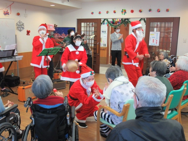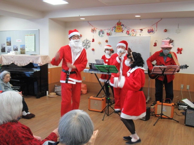 12月は皆さまが楽しみにしている「クリスマス会」を開催しています。 クリスマスケーキを食べたり、クリスマスソングを歌ったり、プレゼントをもらったりと、毎年楽しい1時間をお過ごしいただいています。