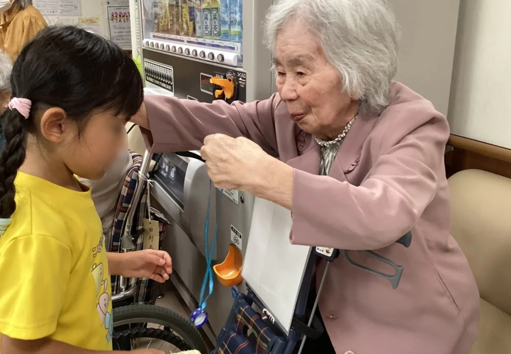 『敬老の日』にあわせ、近くの保育園の園児たちが毎年施設を訪れてくださいます。今年は手話を交えた歌や踊りを披露してくださり、さらには保育園で作った可愛らしい壁飾りも贈呈してくださいました。ご入居者様からは、レクリエーションの時間に作成した「首飾り」を園児たちに直接かけてお返しをさせていただき、交流を楽しみました。可愛い歌声にほっこりした笑顔を見せたり、感動の涙を流されたりする場面もありました。