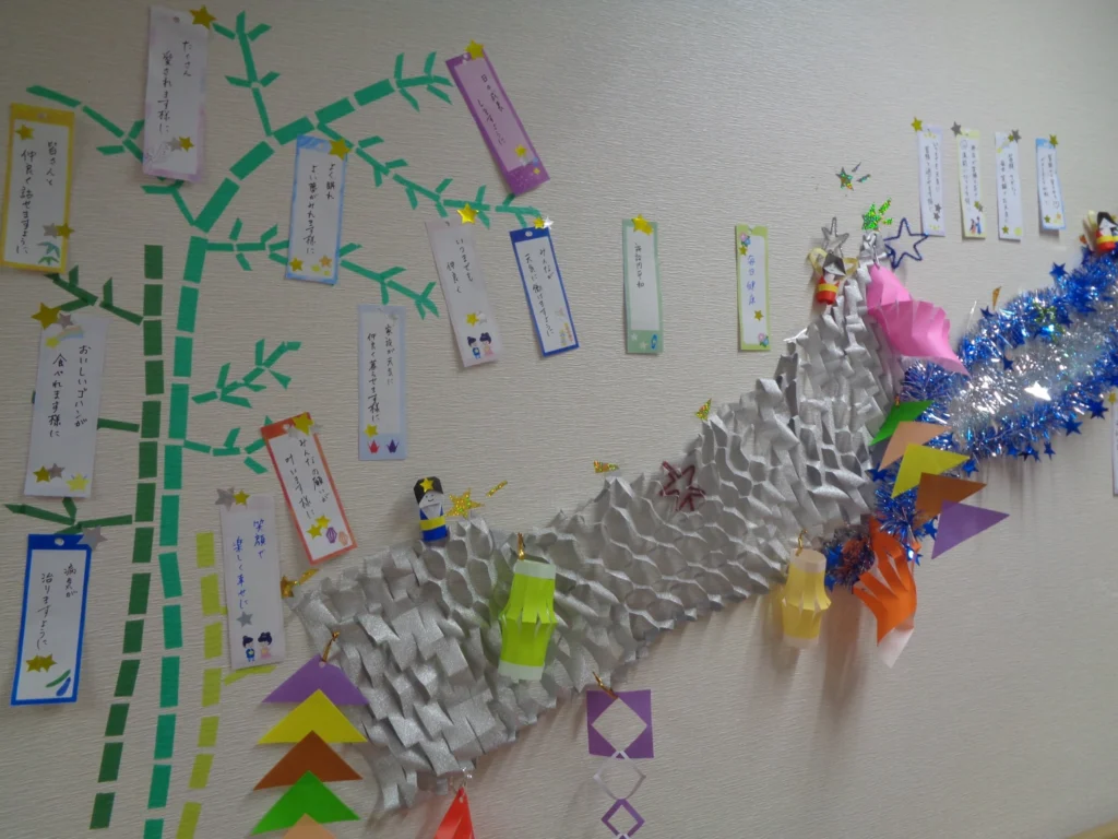 最近では、「七夕」の天の川を真ん中に、ご入居者様の願いごとを川を囲む形で貼りました。