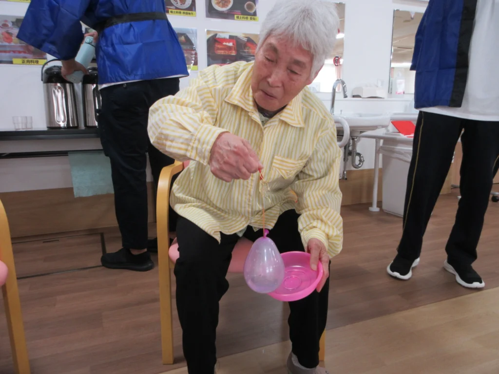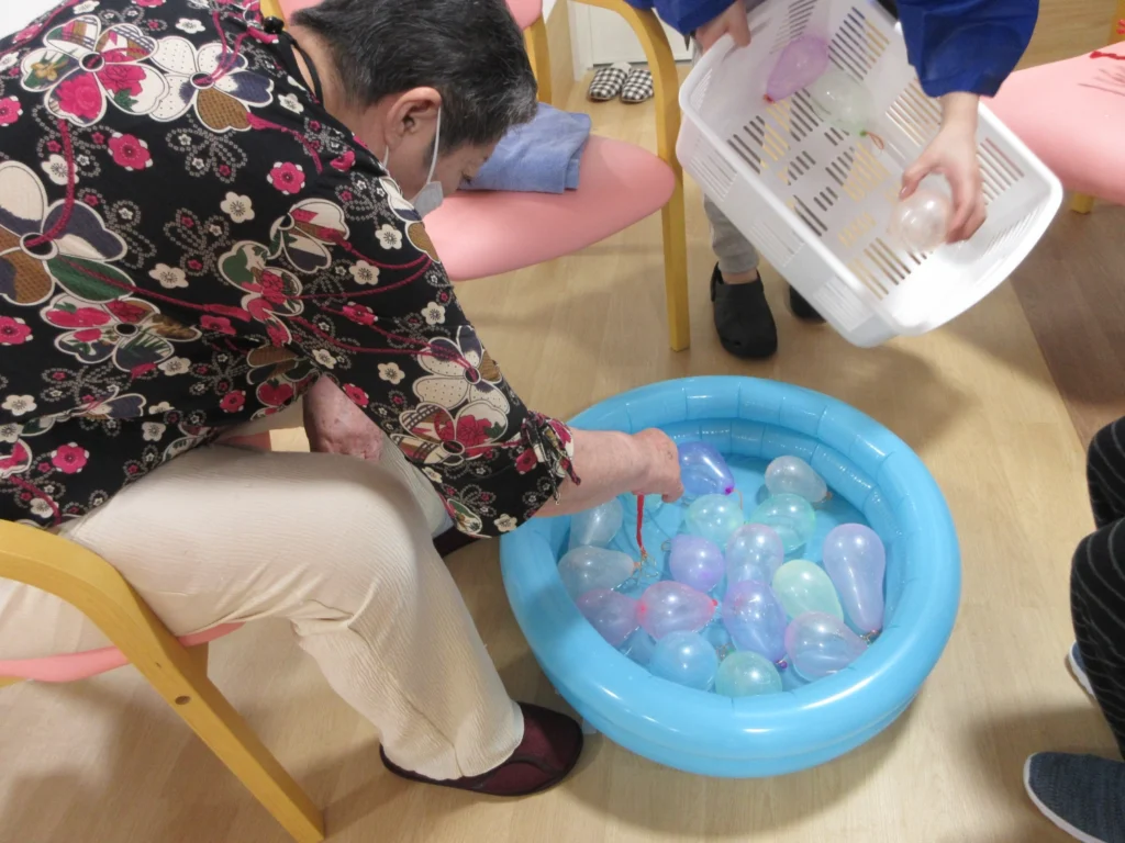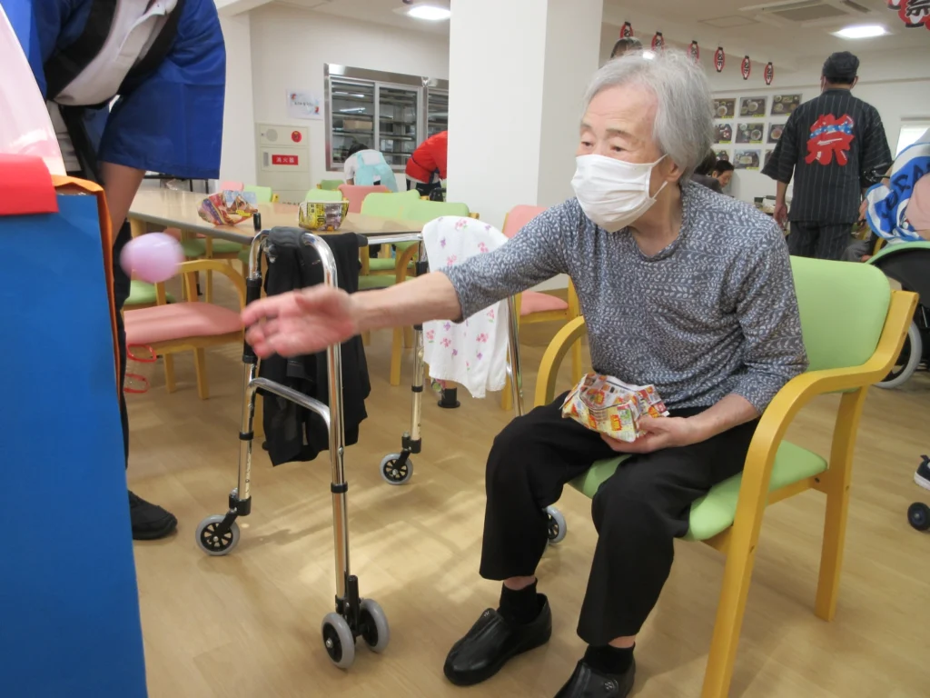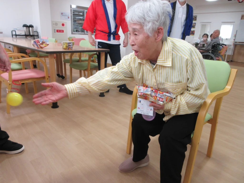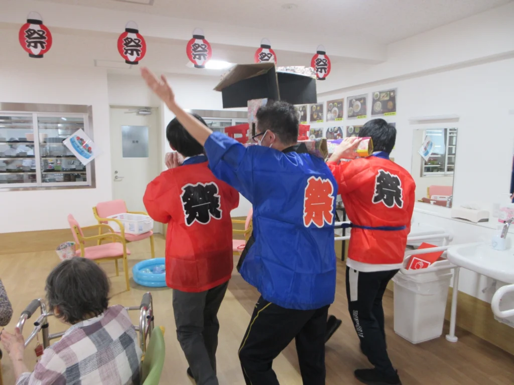 屋台では「射的」「魚すくい」「ヨーヨー釣り」「ボール入れ」などをご用意し、職員と一緒にさまざまなゲームを楽しむ姿は、まるで子ども時代に戻ったかのようでした。