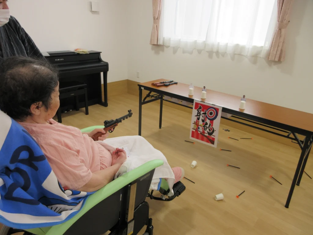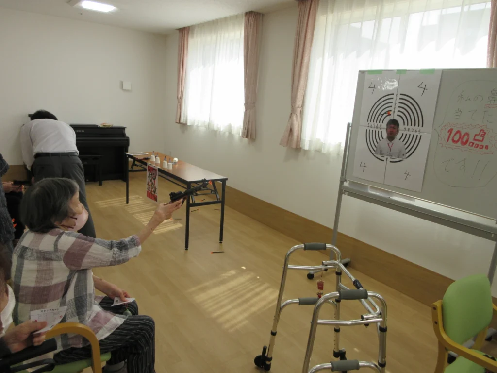 特に盛り上がったのは「射的」で、職員の写真を的として用意したところ、多くのご入居者様からは「すごくおもしろかった!」とのお声をいただきました。皆さまとの夏の思い出がつくれました。