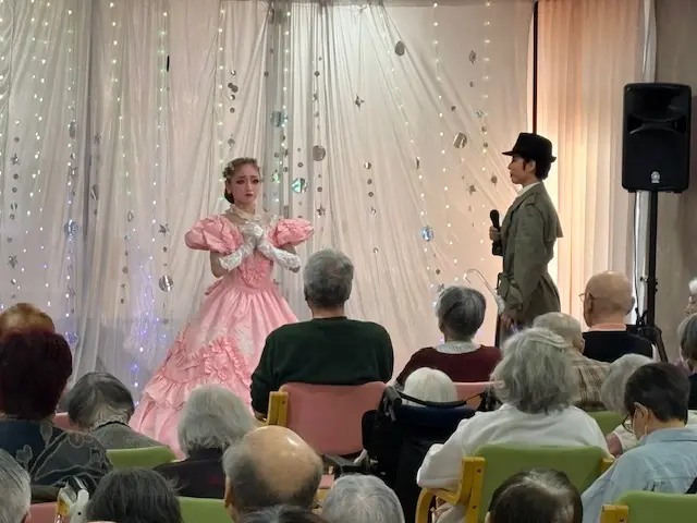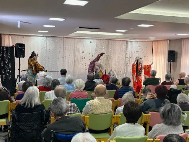 華やかな衣装と迫力ある演技が始まると、会場は一気に舞台の世界へと引き込まれます。昔よく聞いた歌が流れると、自然と手拍子が起こり、口ずさんでいらっしゃる姿も見られました。「若い頃を思い出すね」と目を細める方も。笑いと拍手に包まれたひとときは、心弾む特別な時間となりました。