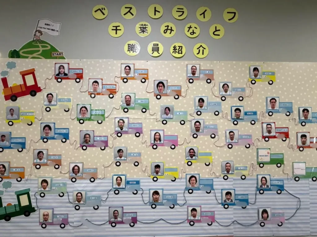 ベストライフ千葉みなとの職員紹介ボードは、定期的にテーマを変えながら、スタッフ一人ひとりが自由に考えた内容を掲示しています。
