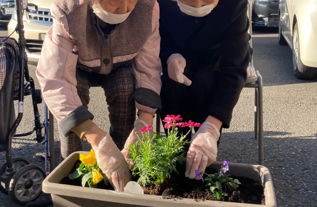 ご入居者様ご自身でお花を選んでいただき、配置を考えながら玄関前のプランターや裏庭に季節の花を植えました。ご自宅の庭の手入れをされていた頃を思い出され、いきいきとした表情や会話が飛び交う楽しいひとときとなりました。