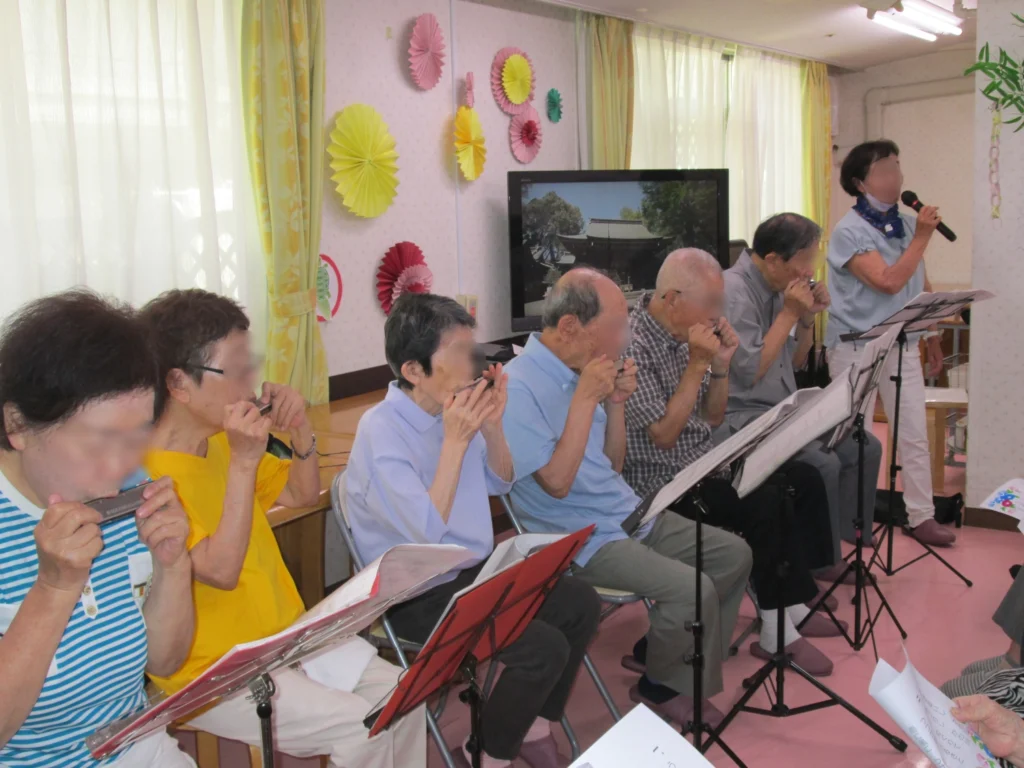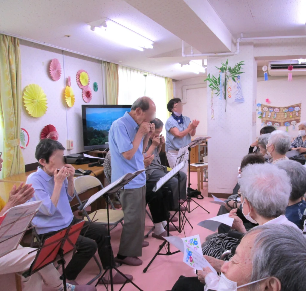 ハーモニカボランティアの方が来てくださいました。 懐かしい曲の数々を素敵に演奏していただき、ご入居者様もとても楽しそうで、一緒に口ずさんだり、時にはじっくり聴き入ったりと、あっという間の時間でした。