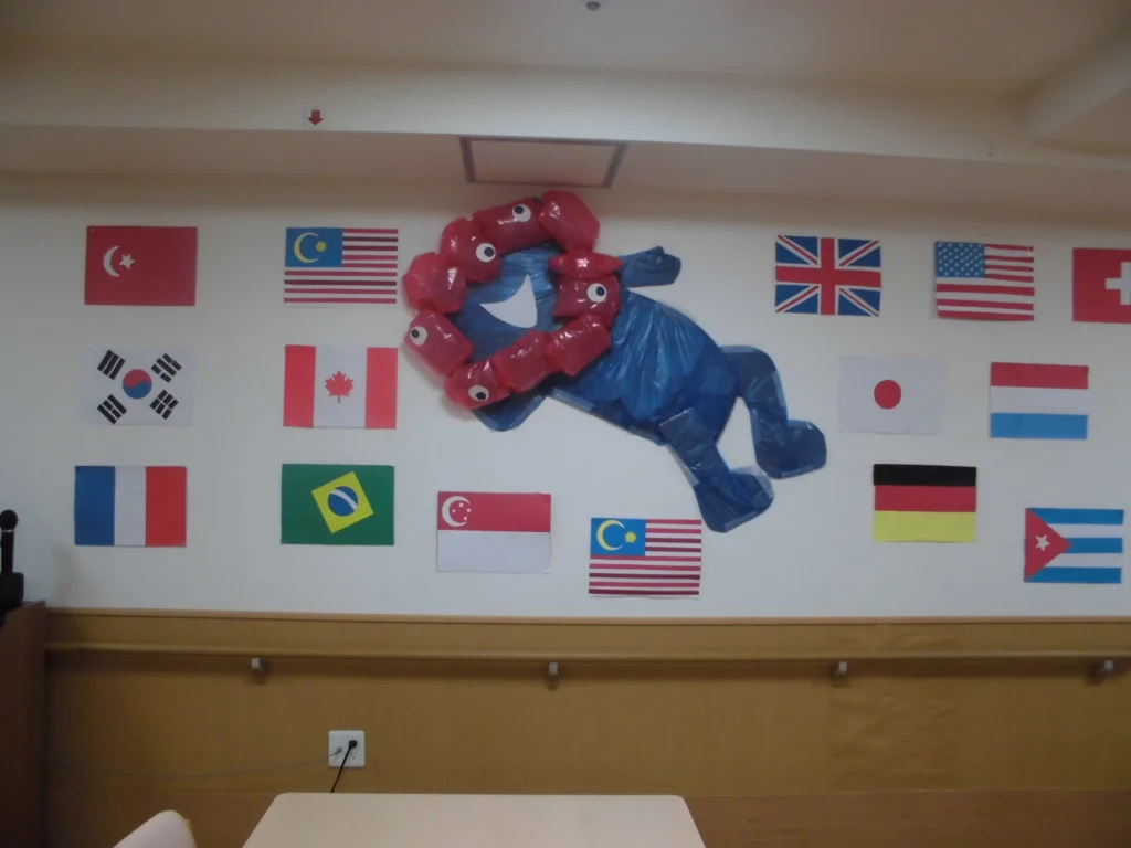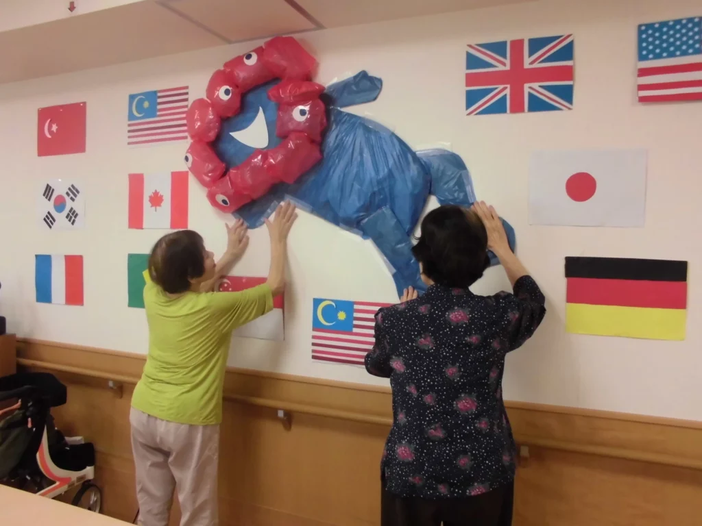 大阪で開催している万博を少しでも感じていただけたらと考え、ご入居者様と一緒に大きな大阪万博のキャラクター「ミャクミャク」を壁面制作しました。