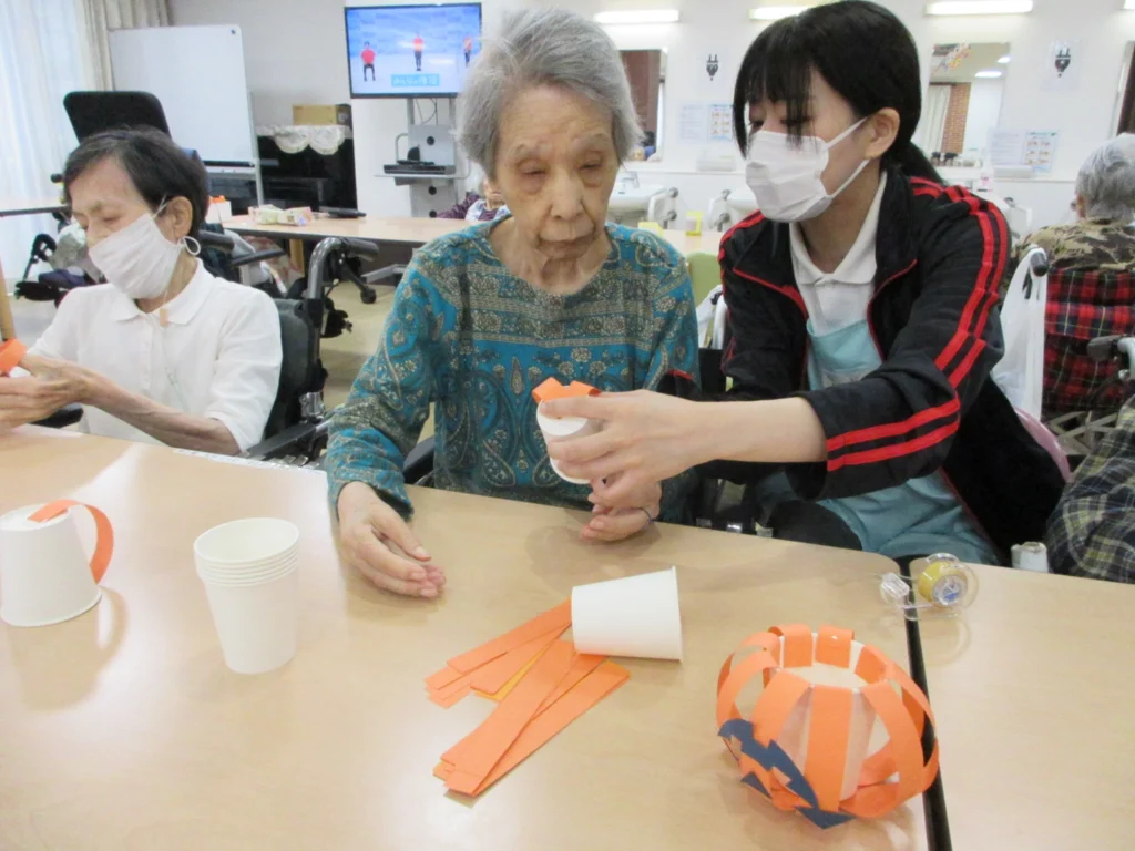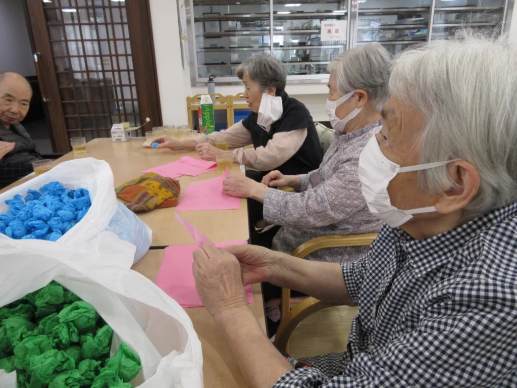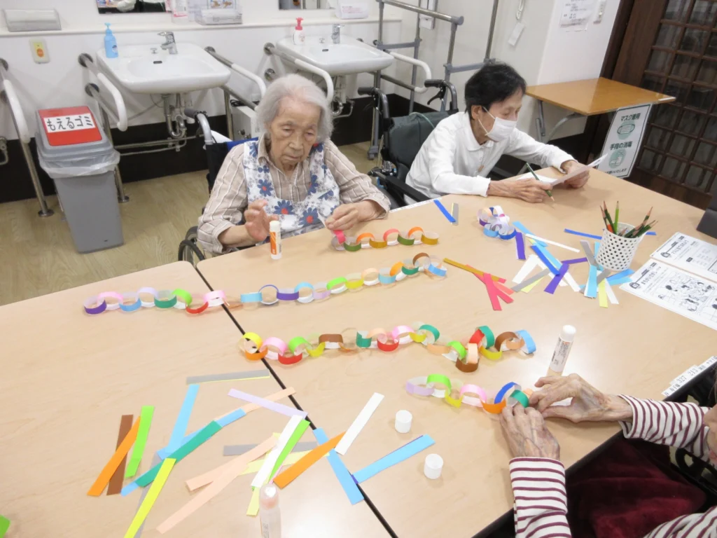 手先も器用で、作り方をじっくり聞きながら製作されています。壁面装飾ができあがると「これ私が作ったのよ!」とご入居者様同士でお話をされています。