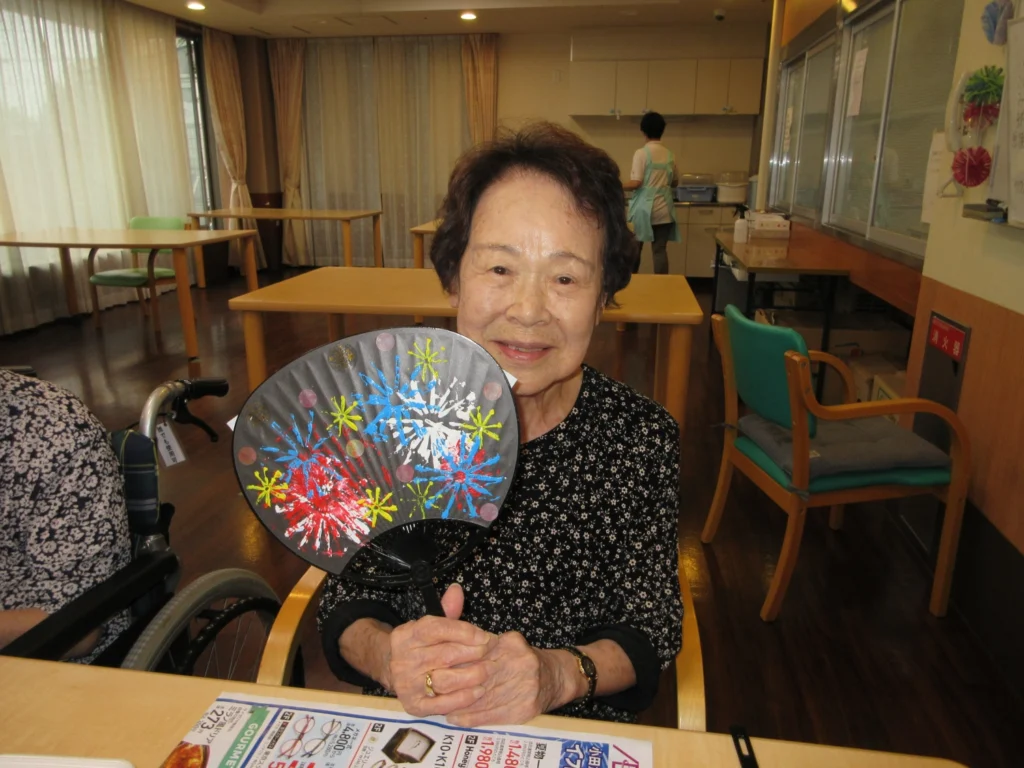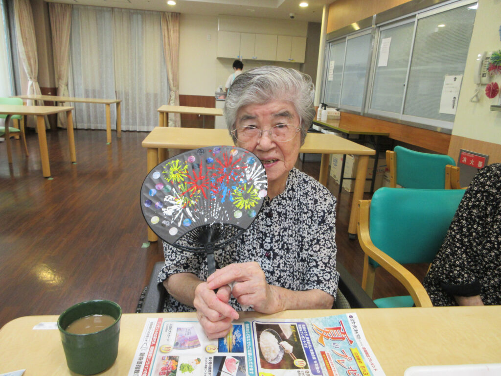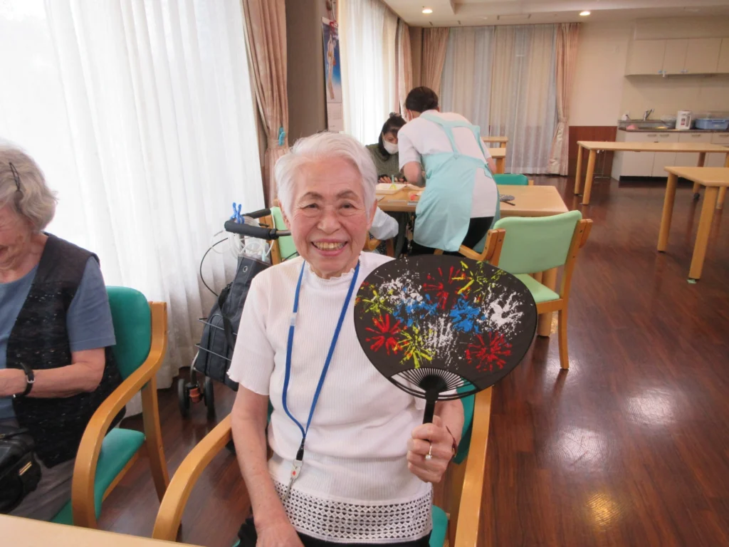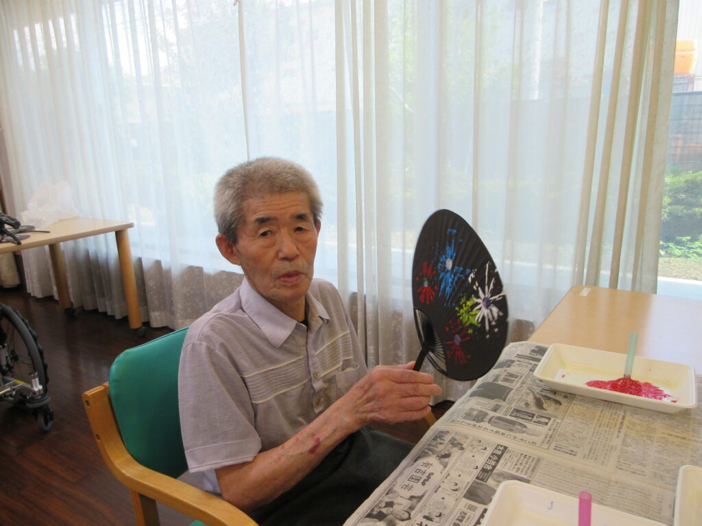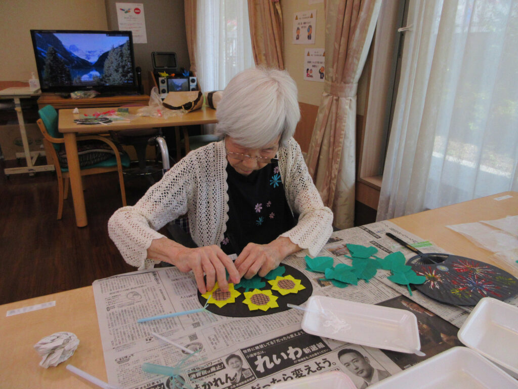絵の具を使って花火を描いたり、折り紙のヒマワリやアサガオで飾りつけをしました!