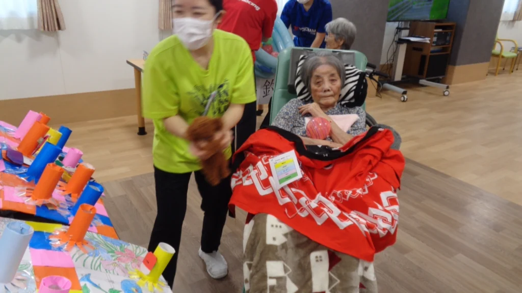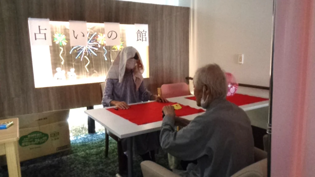 毎年恒例の『夏祭り』を今年も開催しました。今年は「スイカ割り」や「輪投げ」、「ヨーヨー釣り」に加え、目玉イベントとして職員が仮装して行う「占いの館」を企画。ご入居者様も童心に返って、大いに盛り上がりました。