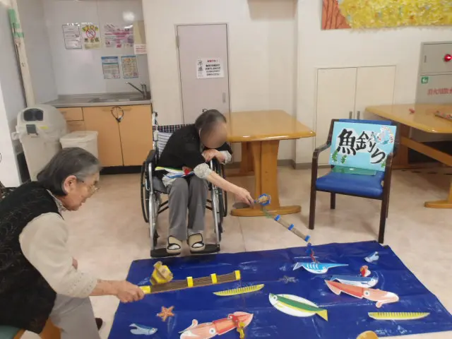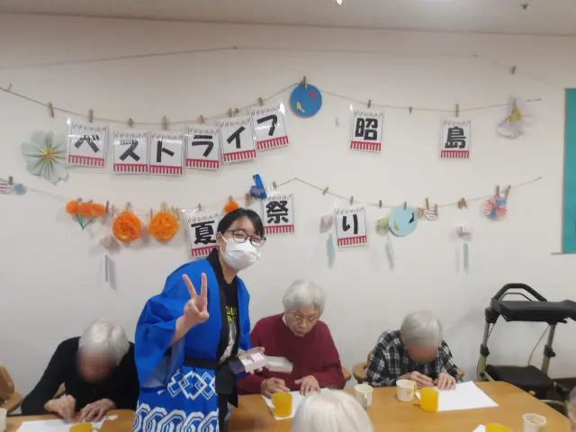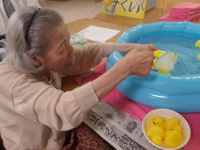 夏祭りの楽しみと言えば……屋台のお菓子や軽食、そして景品があるゲーム!!今年は、「魚釣りゲーム」、「型抜き遊び」や「アヒルすくい」、「射的」、「かき氷」をご用意しました。ご入居者様が笑顔でかき氷を頬張る姿やゲームに熱中する姿を拝見することができ、職員も一緒に楽しむことができました。職員手作りの竿や魚、射的の的などもご入居者様が楽しまれている間、壊れることなく最後まで活躍していました。頑張って制作して良かったです。