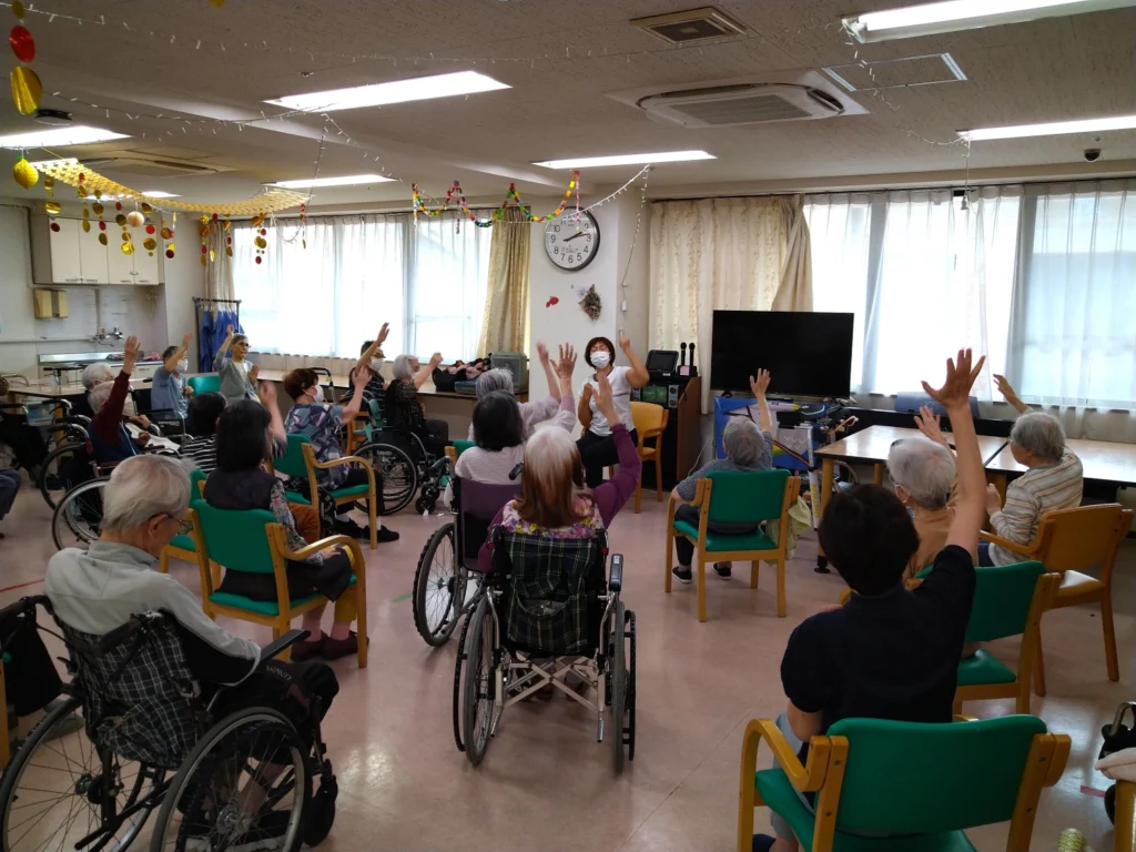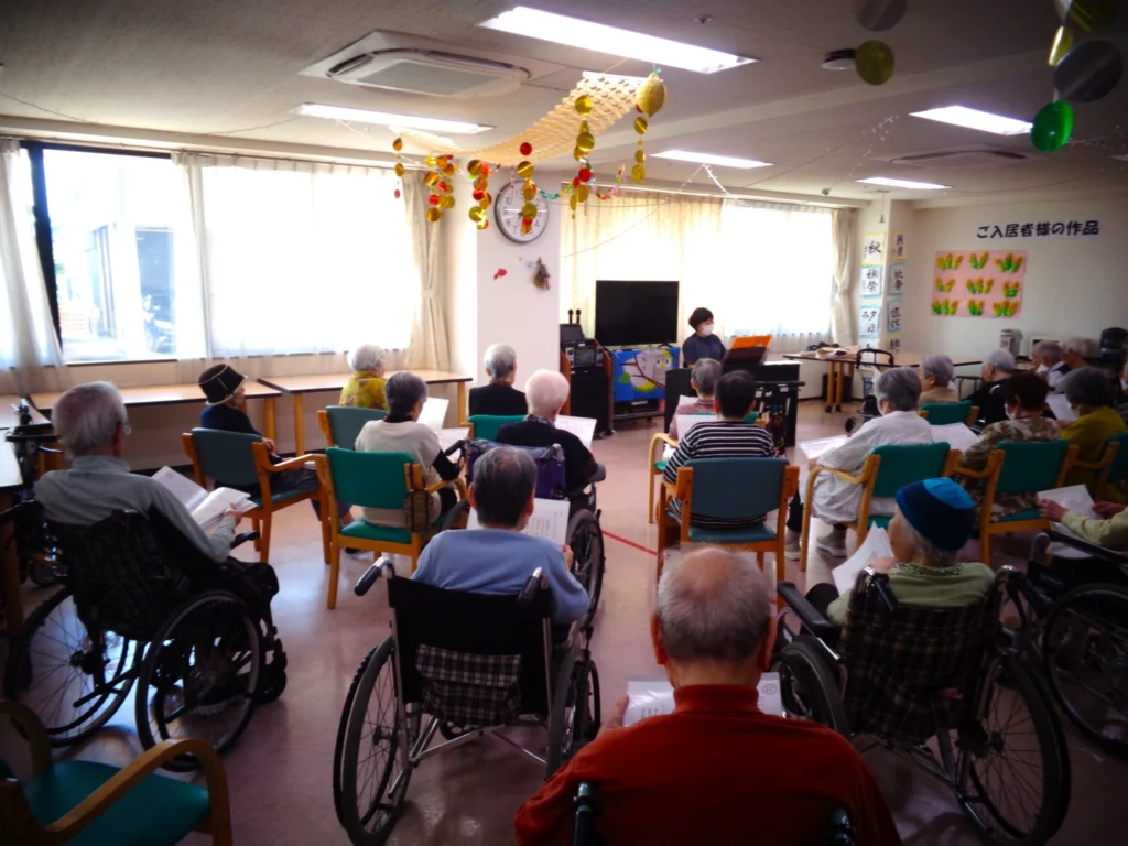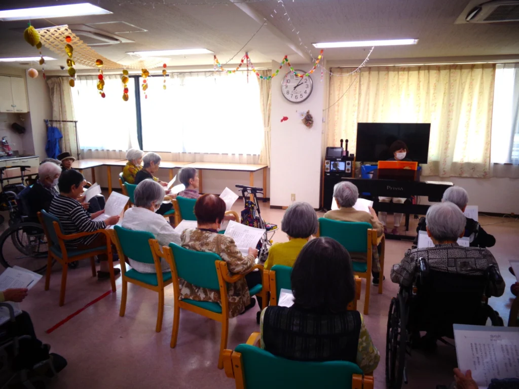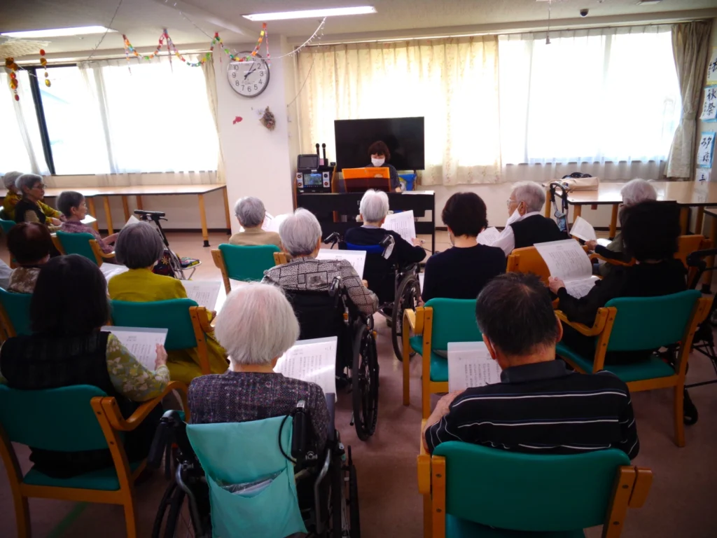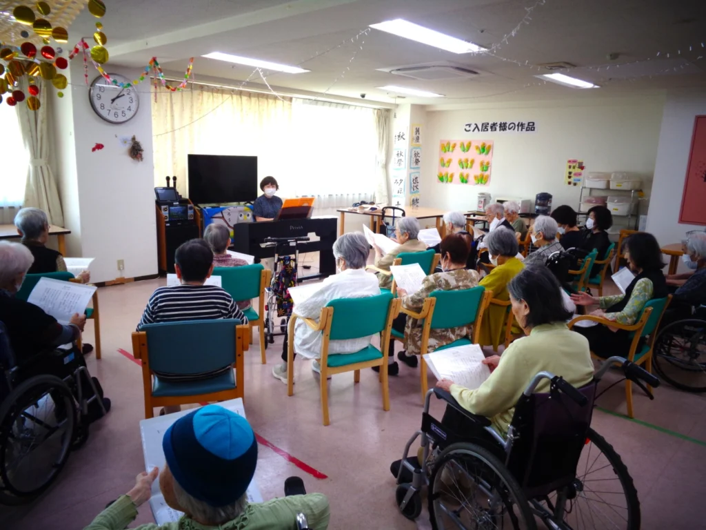 毎日のレクリエーションのなかには、外部講師をお招きして行うプログラムもあります。いすに座ったままで無理なく参加できる「チェアエクササイズ」や、講師の軽快なトークに合わせて楽しく歌う「音楽療法」など、ご入居の皆さまにご好評いただいています。リズムに合わせて体を動かしたり、懐かしい歌を口ずさみながら昔を思い出されたりと、自然と笑顔がこぼれるひとときとなっています。