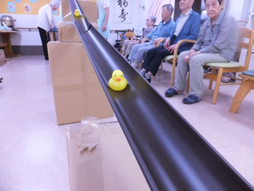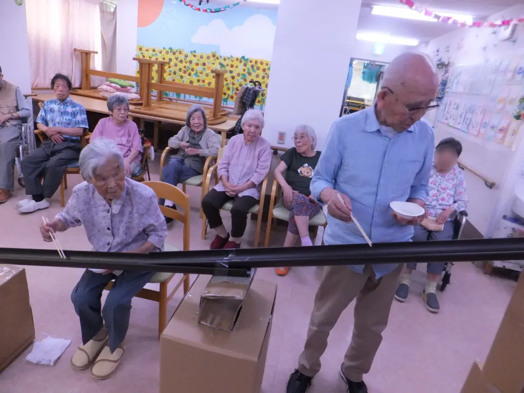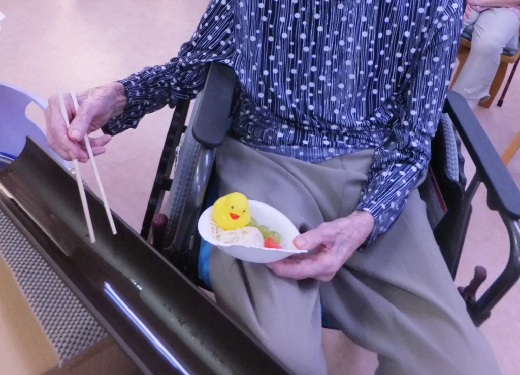 7月には流しそうめんも。たまにアヒルが流れてきたりブドウが転がってきたりと、大盛り上がりでした!!