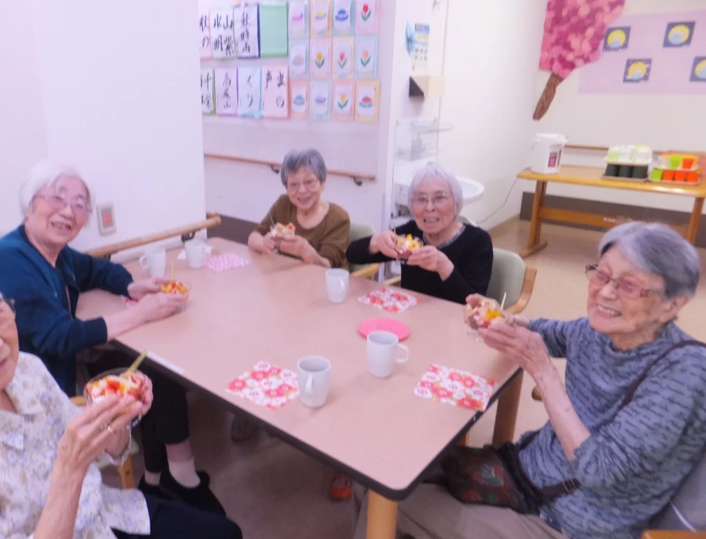 自分たちで作った料理を皆で食べて「美味しいね~」と笑顔があふれます。お汁粉やパンケーキ、カップちらし寿司やプリンアラモードも作りました。