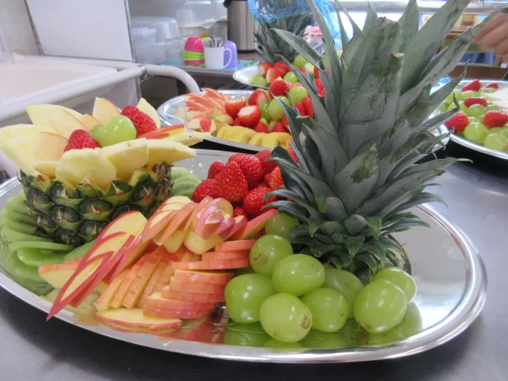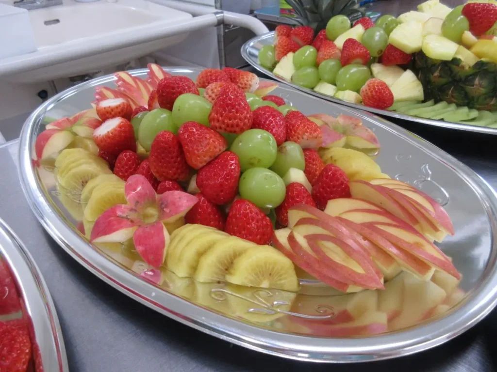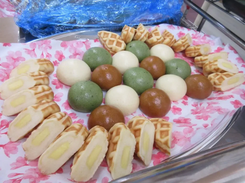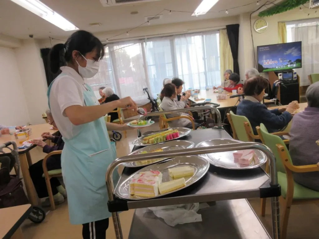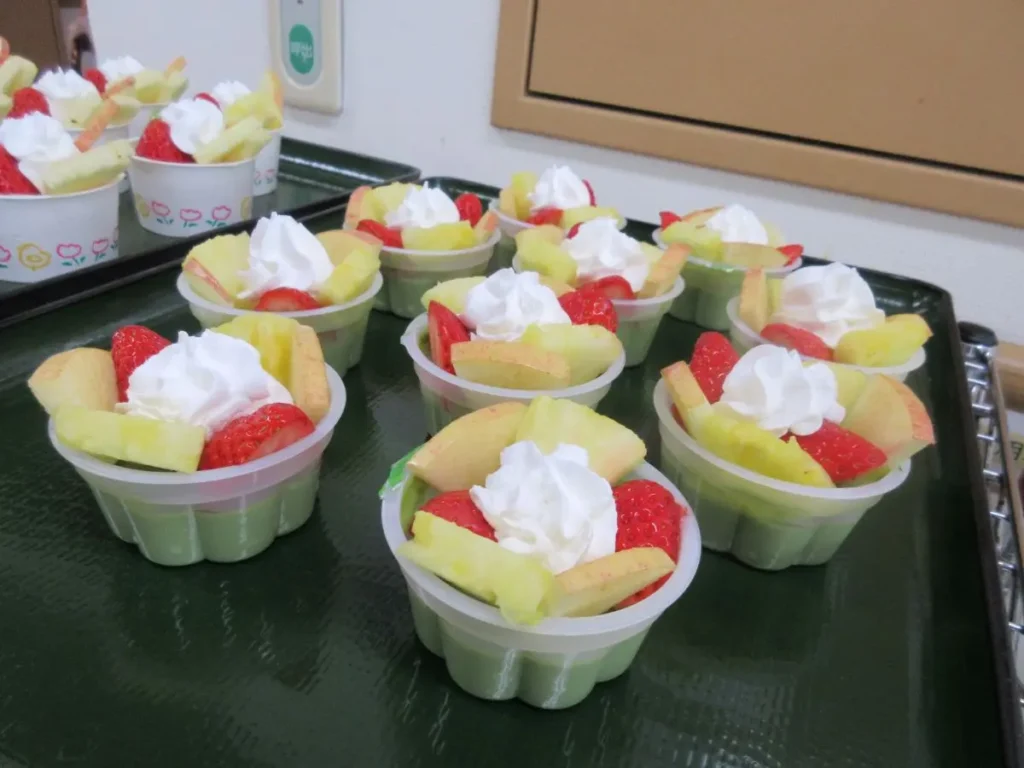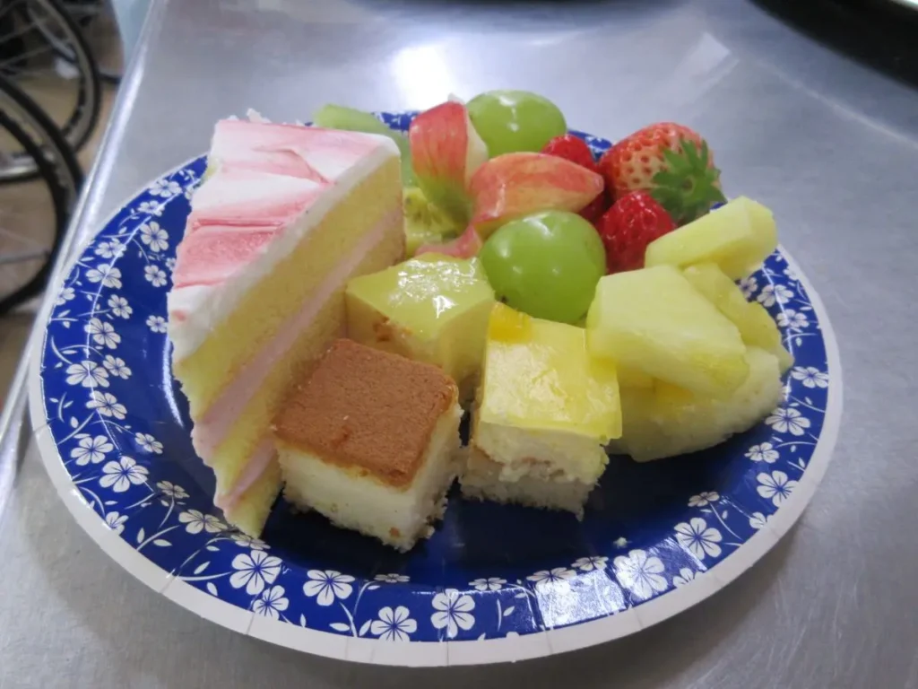 ケーキやロールケーキ、色とりどりのフルーツ、和菓子などが大皿にずらりと並び、食堂は甘い香りに包まれました。