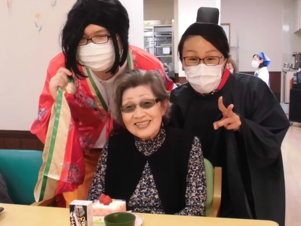 催しの際には、職員が催しに合わせた仮装をして、職員もご入居者様と一緒に楽しませていただいています。ご入居者様からは、「あなた似合っているわよー」「あなたは似合っていないわねー」「うわー驚いたわー」といった感想をいただきながら、毎回盛り上がるイベントになっています。