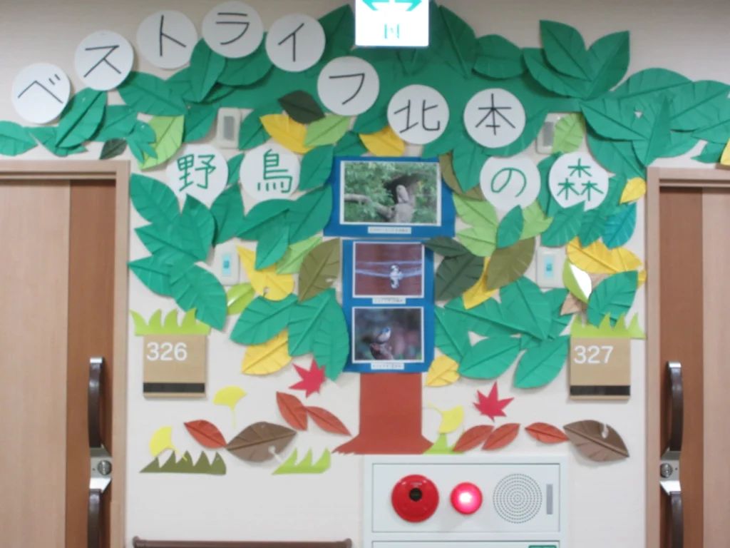 ご入居者様に季節を感じていただけるよう、今月は「コスモス畑」に「ぶどうの実」が実るデザインです。コスモスは、レクリエーションの時間を使ってご入居者様と一緒に制作しました。
