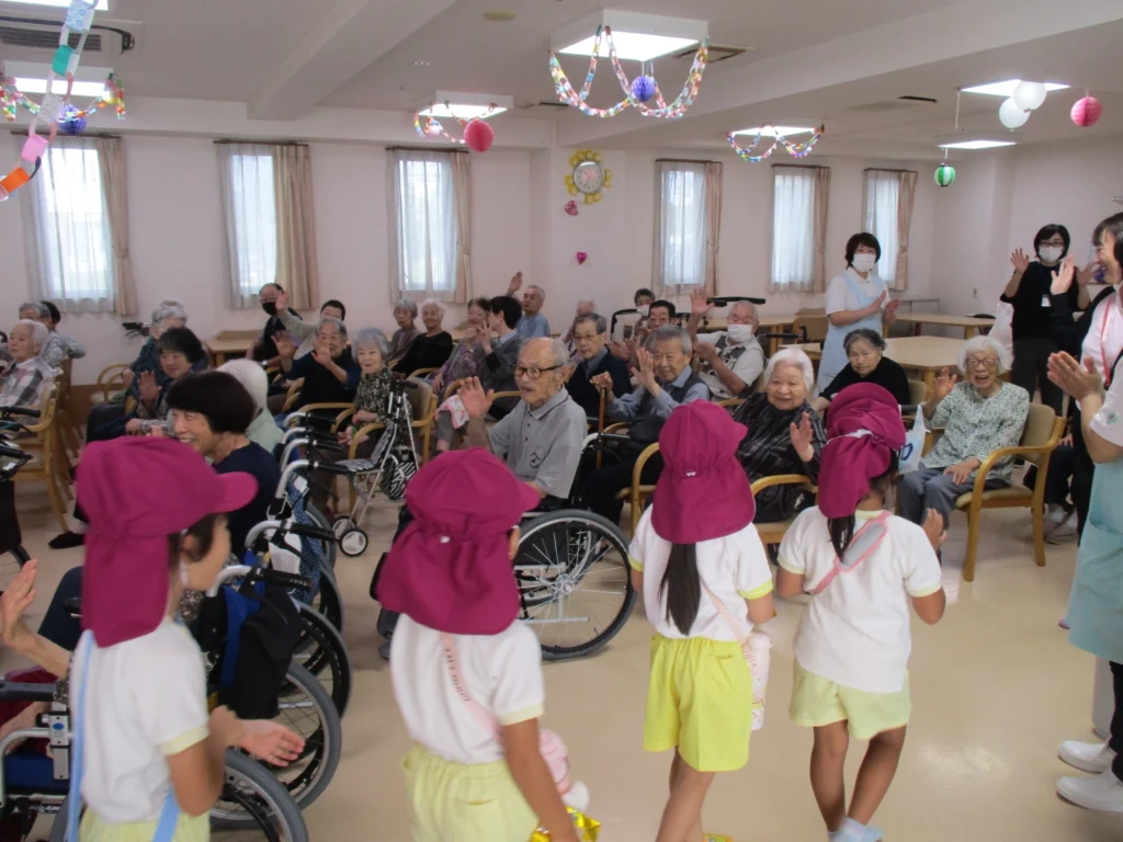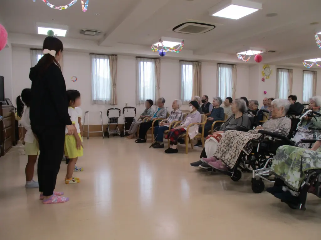 保育園で日頃踊っているダンスや体操を披露してくれ、その可愛らしい姿に、ご入居者様の目尻も下がりっぱなし。普段はあまりレクリエーションに参加されない男性のご入居者様も、この日は早くから席について心待ちにされていました。「かわいいね」「また来てね」「うれしいよ」と、目を潤ませながら声をかけられる姿も見られました。