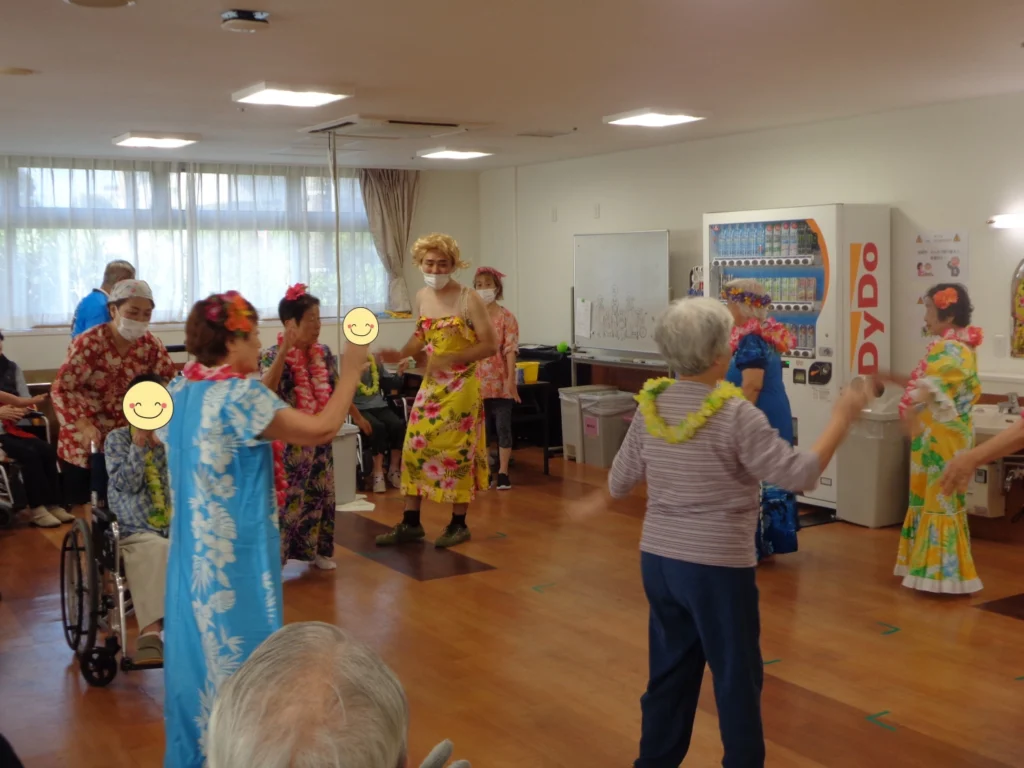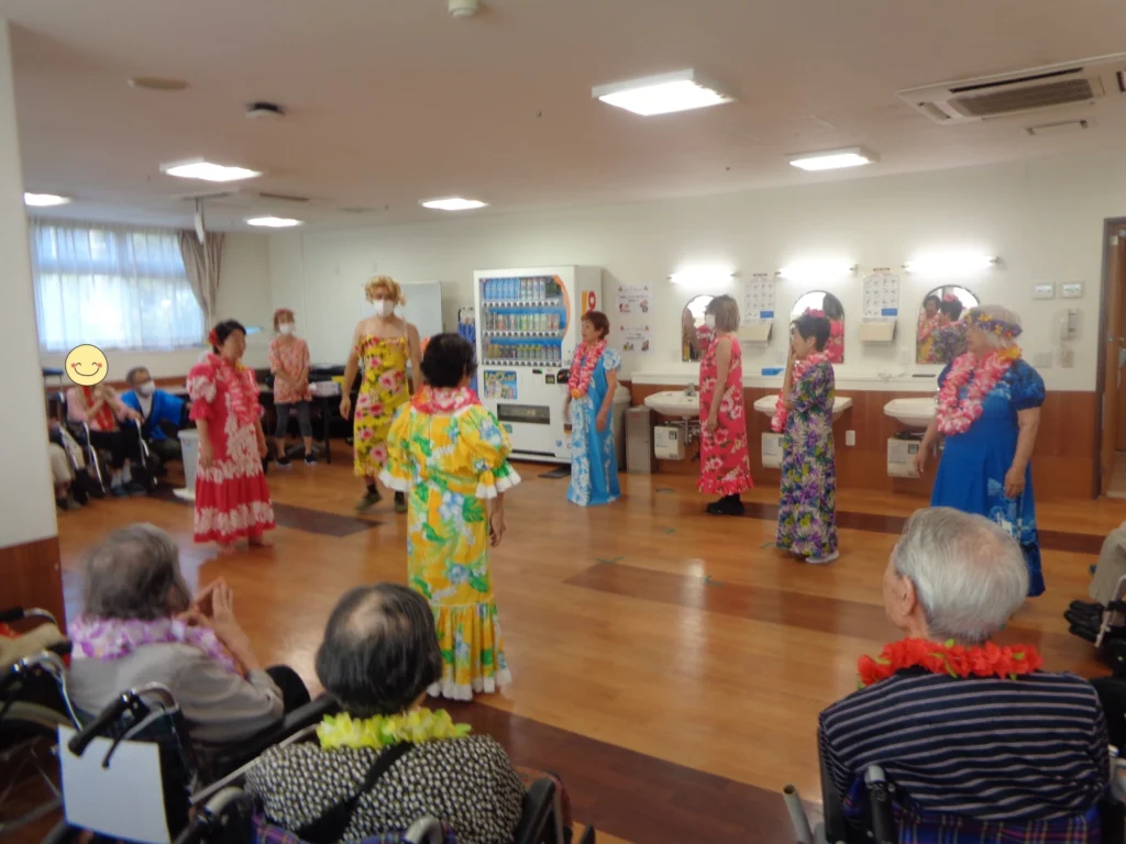 ボランティアの方々を招いての「盆踊り」と「フラダンス」。それを見ながら「懐かしい」「昔は踊ったけど………」と、車いすの方も身体を動かしてくださいました。