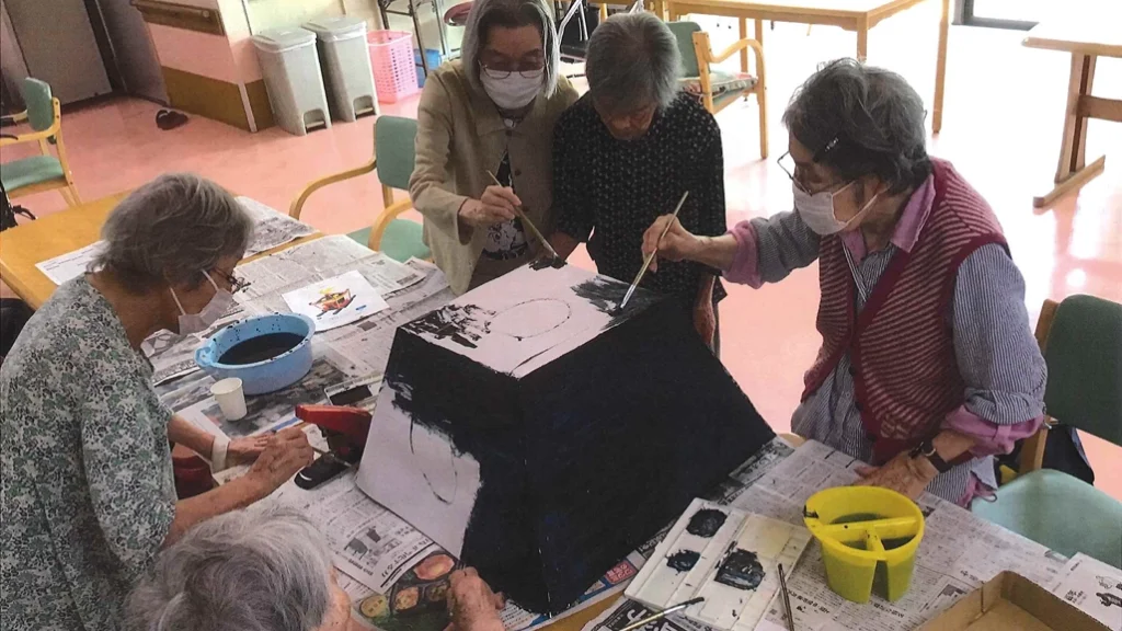 ご入居者様と一緒に作った立派な「神輿」に「輪投げ」や「くじ引き」、「人形すくい」をされて大いに盛り上がりました。