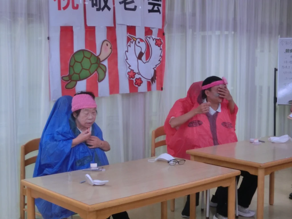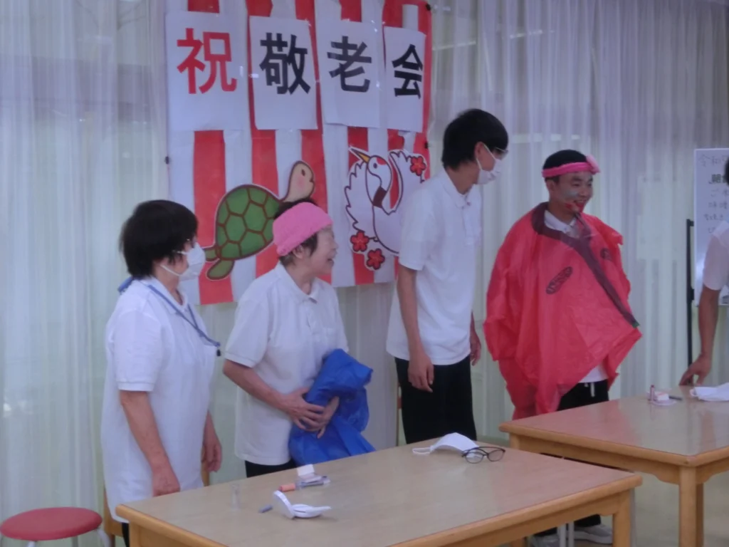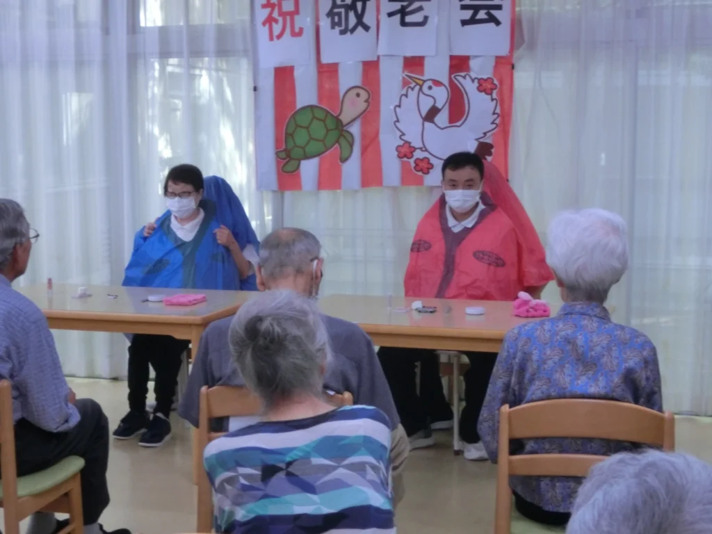 レクリエーション委員会がロビーを華やかに飾り付け、敬老の日をお祝いしました。職員による出し物「二人羽織」も披露、そのテーマは「お化粧」です。中国から来た技能実習生は今回、「二人羽織」初挑戦!数々の工程を経て「お化粧」が仕上がっていく姿に、ご入居者様からは大きな歓声があがりました。完成した姿を見た実習生本人たちも思わず大笑い。笑いに包まれた、賑やかで楽しい一日となりました。
