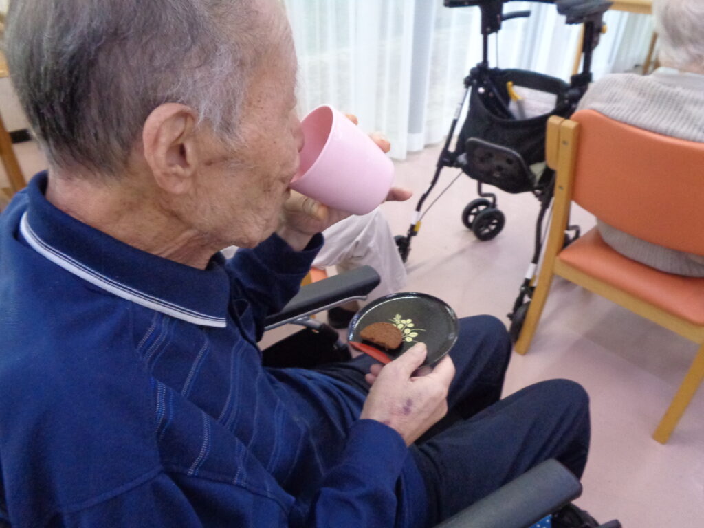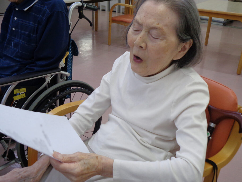 また、会の後半には皆さまと馴染みの深い「上を向いて歩こう」「見上げてごらん夜の星を」を合唱し、笑顔のあふれる会となりました。最後はお茶菓子で一服。