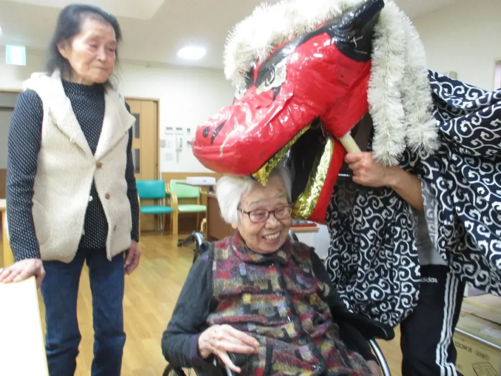さらに、獅子舞も登場し、皆さまの健康と無病息災を願い、会場を盛り上げてくれました。獅子舞と一緒に写真を撮ったり、近くでご覧になったりと、お正月ならではの雰囲気を楽しまれているご様子でした。 本年もご入居の皆さまに安心して穏やかにお過ごしいただけるよう、スタッフ一同努めてまいります。
