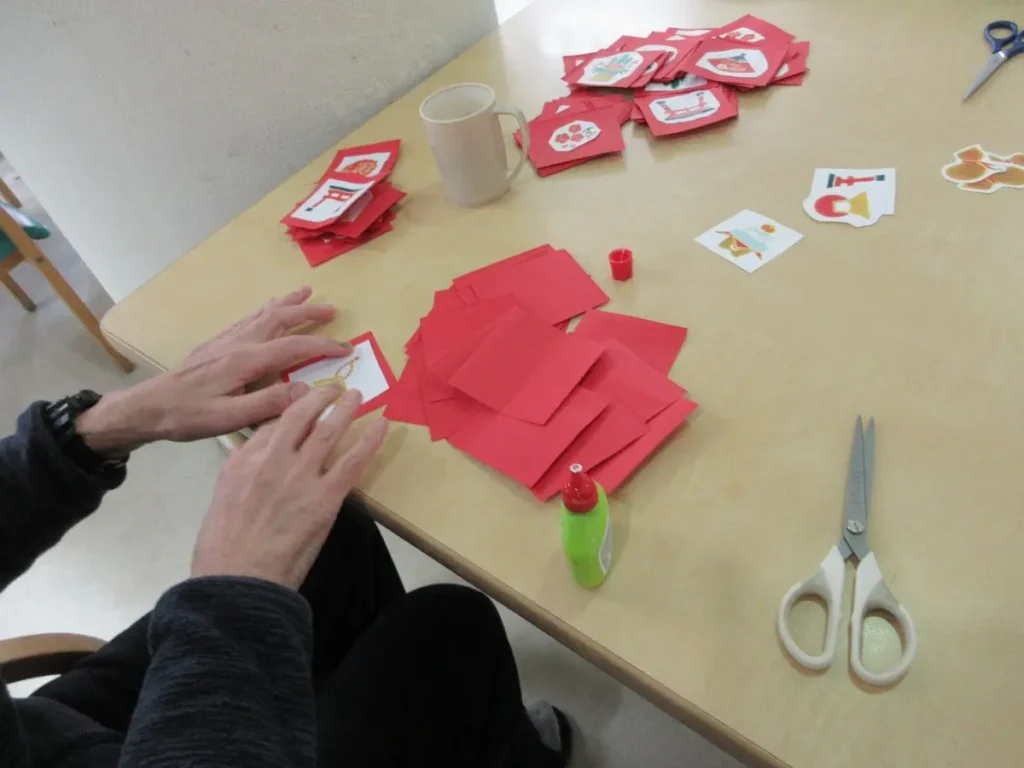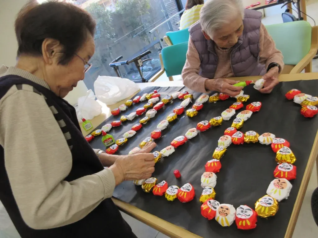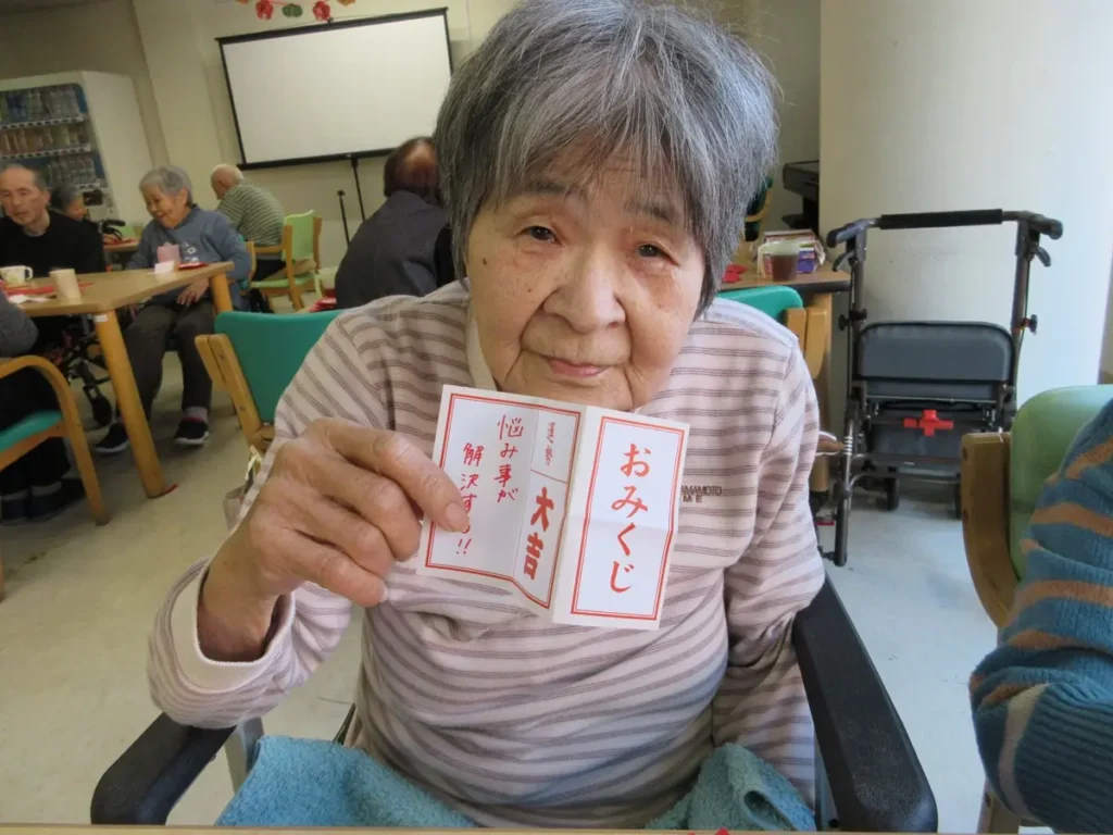 2026年最初のレクリエーションは「新年会」。皆さまで作った新年の飾りを飾り、手作りの絵合わせを楽しみました。おみくじを引いたり獅子舞が登場したりと、お正月らしい楽しい時間となりました。