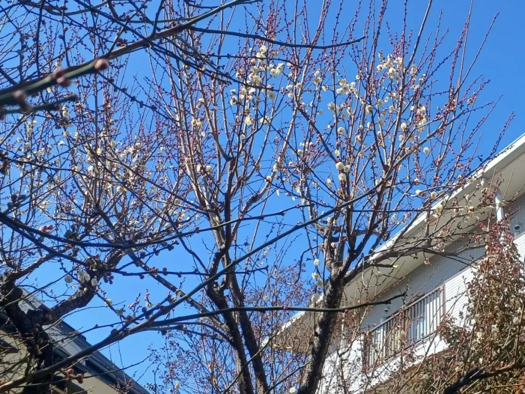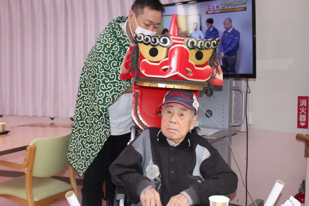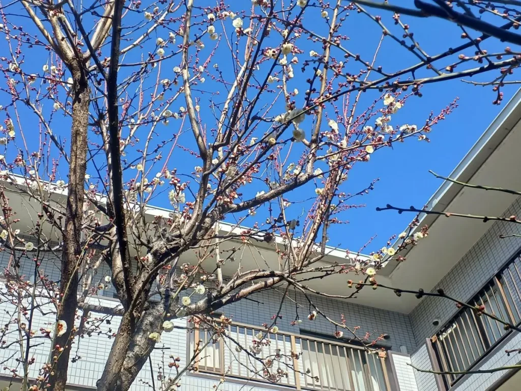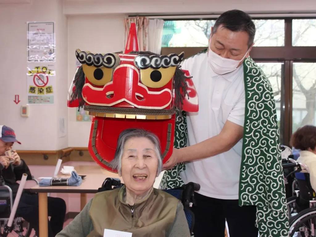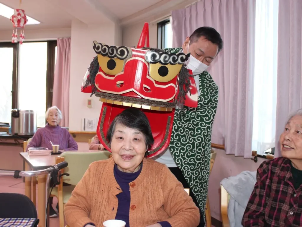 1月の季節行事は、新年会を開催しました。ベストライフ松戸では、新年を『獅子舞』でお祝いするのが恒例です。皆さま獅子に頭を噛んでもらい、長寿と無病息災を願いました。中庭を見ると梅の花がほころび始めました。もう春の兆しですね。