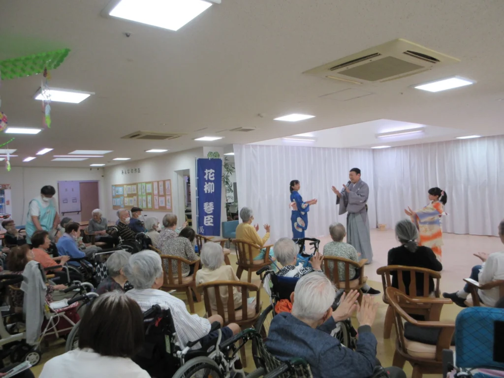 舞台で活躍されている日本舞踏の「花柳琴臣」様に来ていただき、舞台同様の演舞や、娘様たちによる演舞などを披露していただきました。また、ご入居者様へ手だけで踊れる舞踏をレクチャーしていただき、貴重な体験となりました。