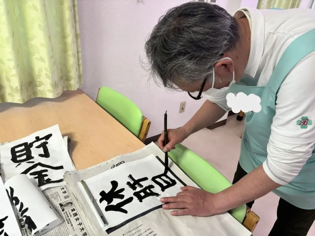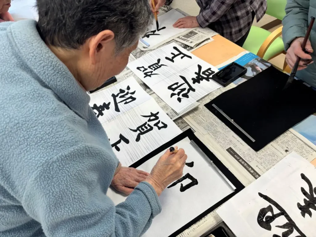 「うまく書けるかしら…」と心配されていたご入居者様も、いざ筆を執ると真剣な表情に。お手本を見ながら、一枚一枚ていねいに書き上げていらっしゃいました。 スタッフも負けじと、それぞれの今年の抱負をしたためました。