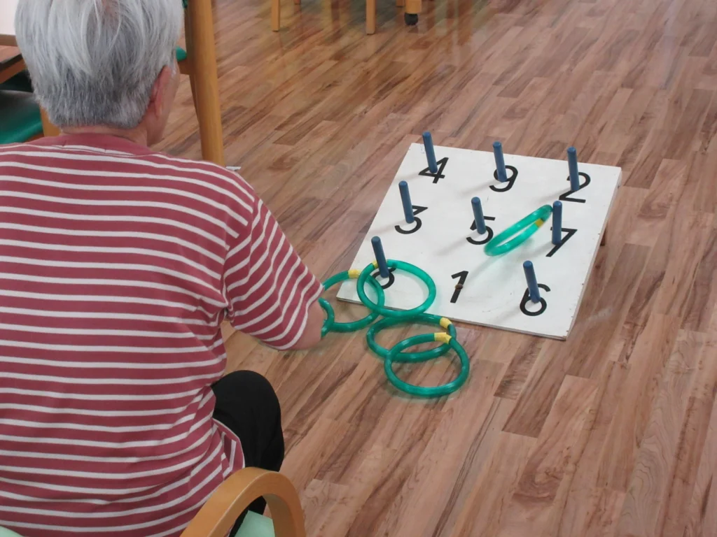 また簡単なゲームとして、机の上で行う『ホッケー風ゲーム』や『わなげ』などのさまざまな方に楽しんでいただけるアクティビティも企画し開催しています。職員も驚くほどの激しい動きをされる方もいらっしゃいますが、介護職員や看護職員も参加(見守り)し、「楽しく・安全に」を主軸に行っています。